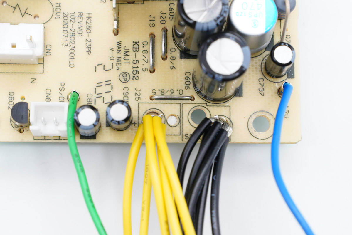 输入母座的地线和金属机身壳连接,火线零线焊点打胶加固。风扇供电导线套有绝缘胶管。