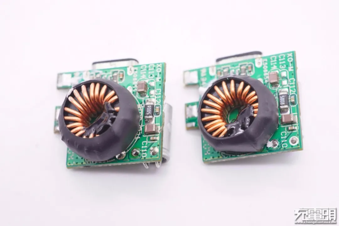 磁环电感,在以前比较老式的充电器中,应用相当广泛,但在现在小型化需求,电路开关频率越来越高,磁环电感越来越失去优势,交流损耗变差,效率低,发烫,如果要让效率进一步提高,要用更大直径的磁环,但又违背了充电器要往小型化发展的市场需求方向。对现在超高功率密度的多口充电器来说一是空间占用多,另外就是发热高,磁环电感不是很适用。