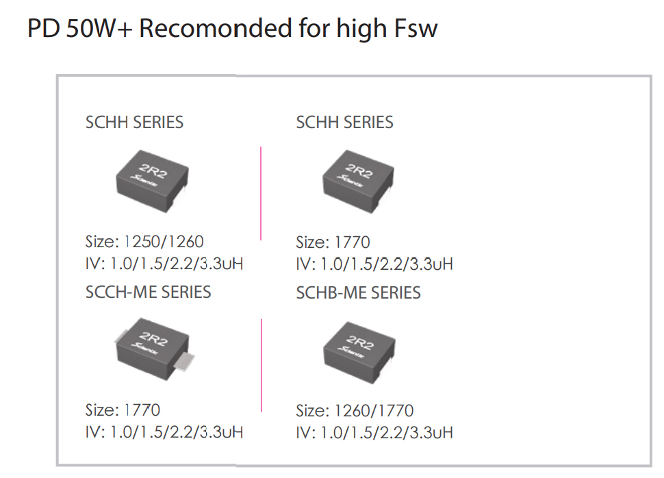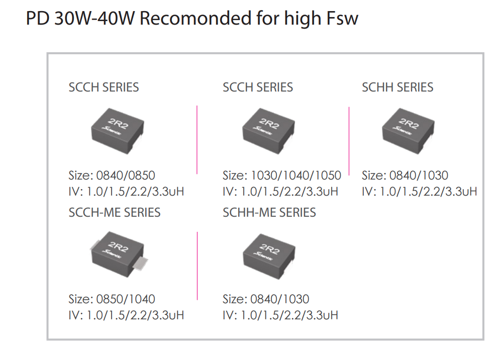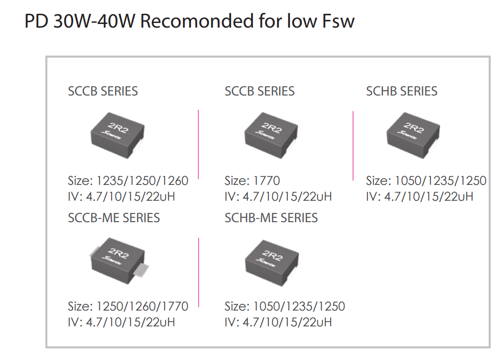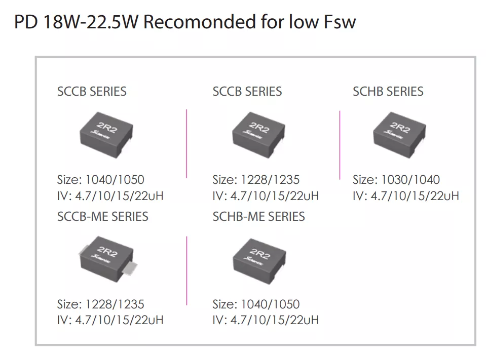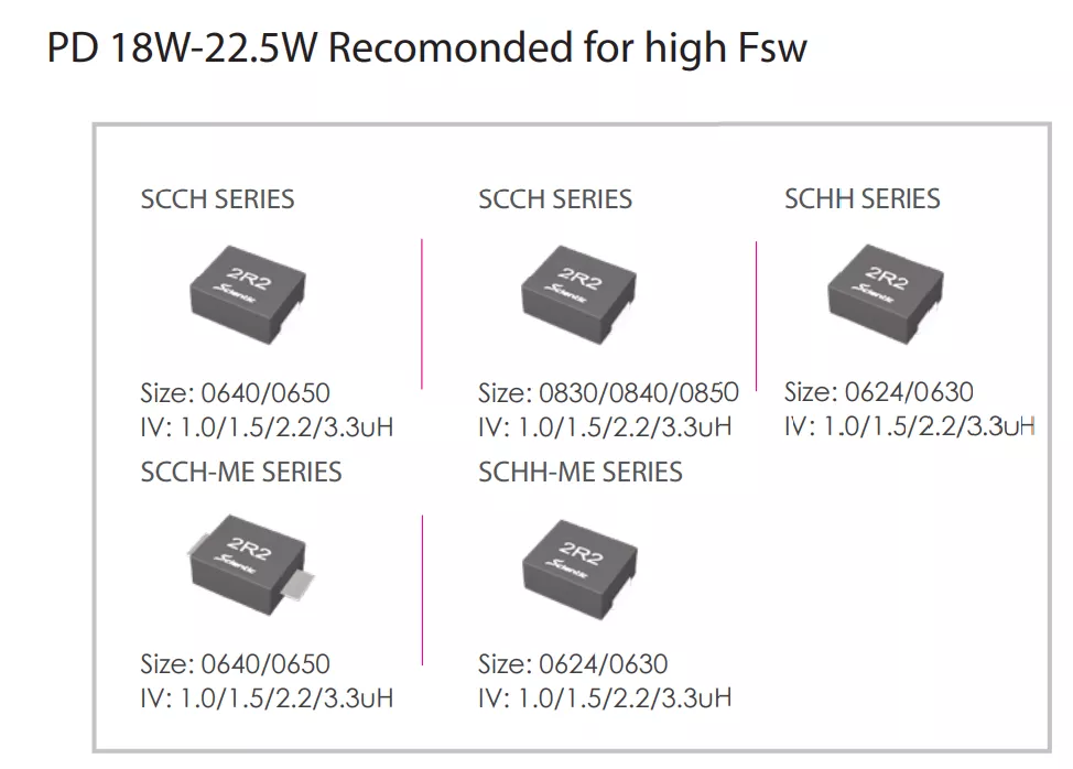 如下,列举PD电感中较为主推的产品系列,针对目前较为通用的PD几档功率来进行分类,可供参考: