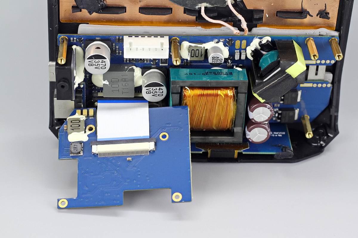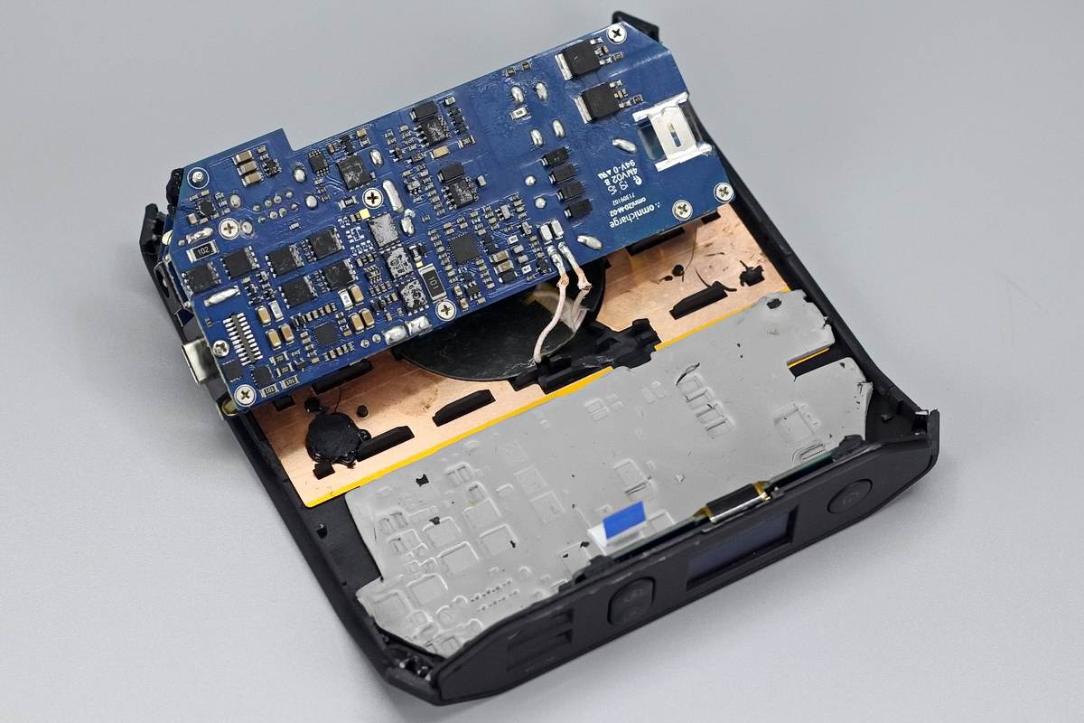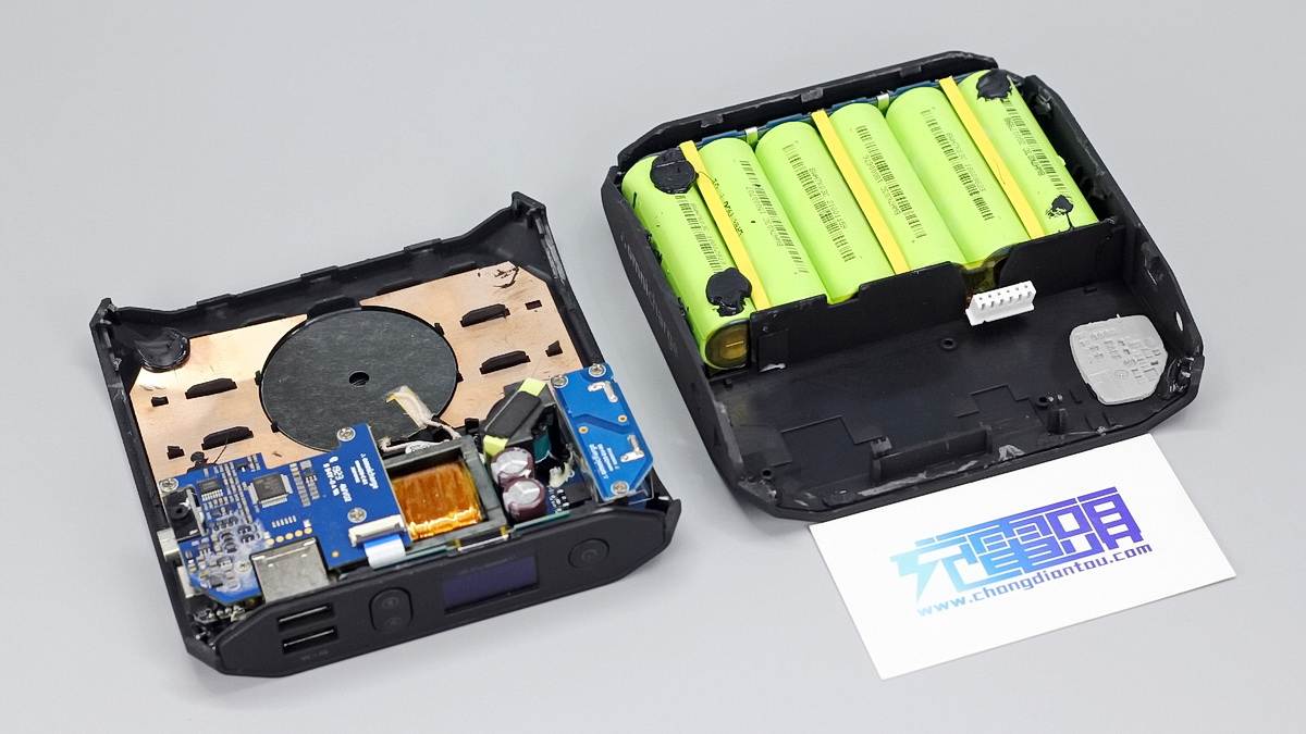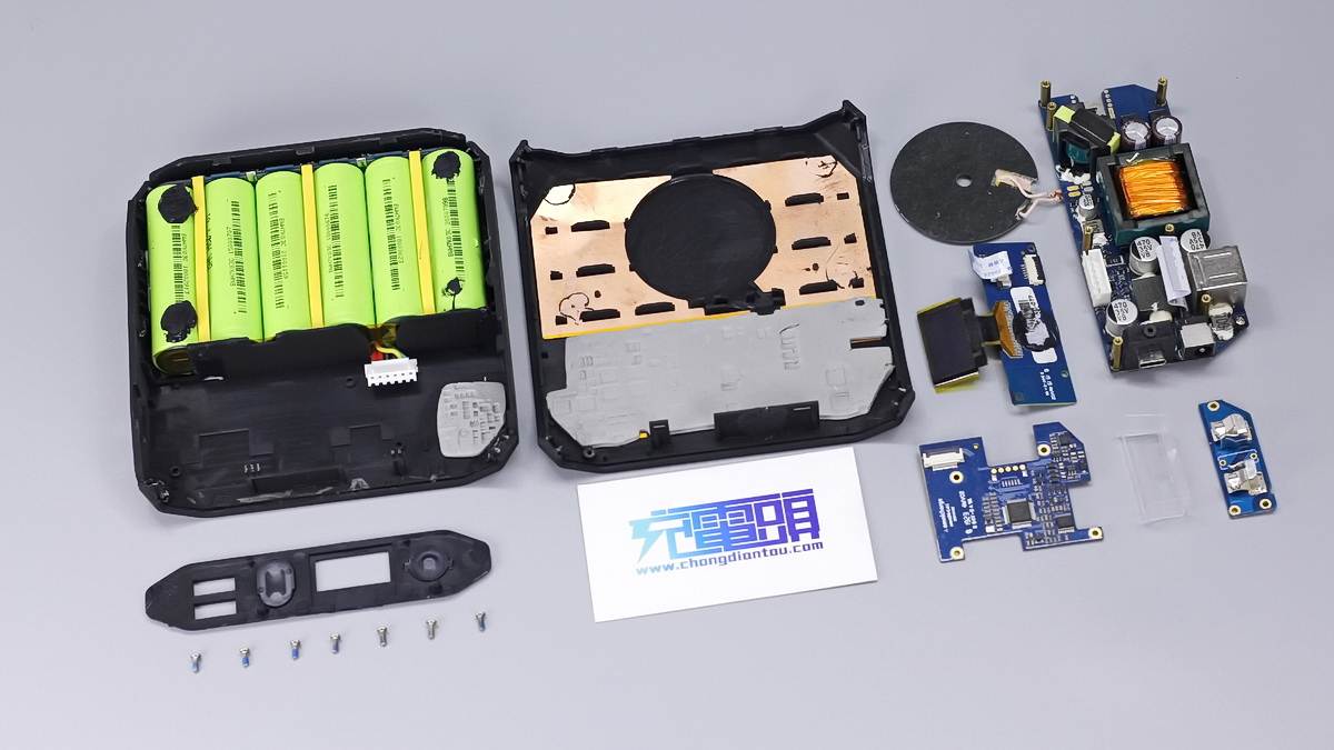 Omni 20+充电宝拥有DC、USB-A/C接口以及AC输出插口。其中DC、USB-C口均支持双向快充,最大功率可达100W。AC插口支持100W交流输出,再一对比此前拆解的储能电源的逆变器模块,虽然功率比不上,但能在如此小的多合一充电宝里塞入逆变输出电路,着实让人觉得不可思议。那下面就来看看这款产品的内部是如何设计的。