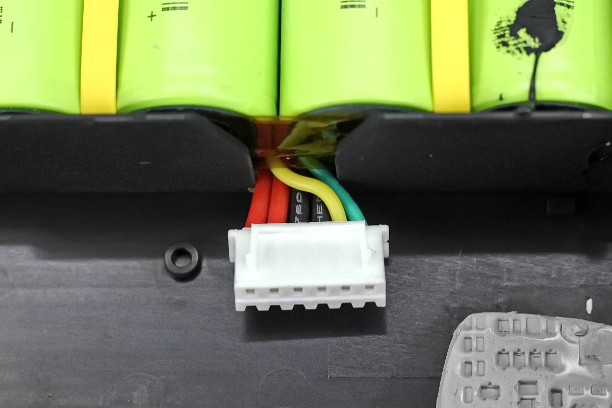 电池和保护电路板镍片点焊连接,PCB板上可以看到六颗相同的保护芯片,整个板子注塑保护。