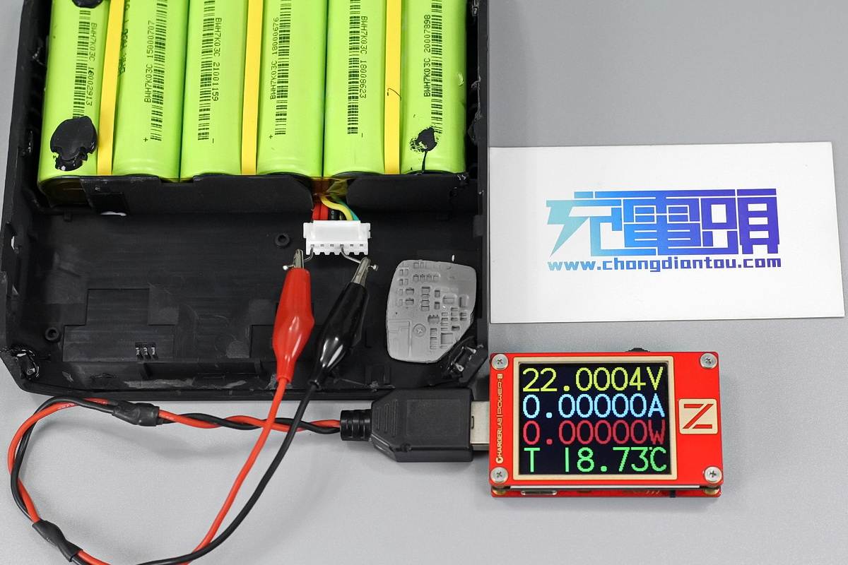 使用ChargerLAB POWER-Z KT002可以测得电池组空载电压达22V。
