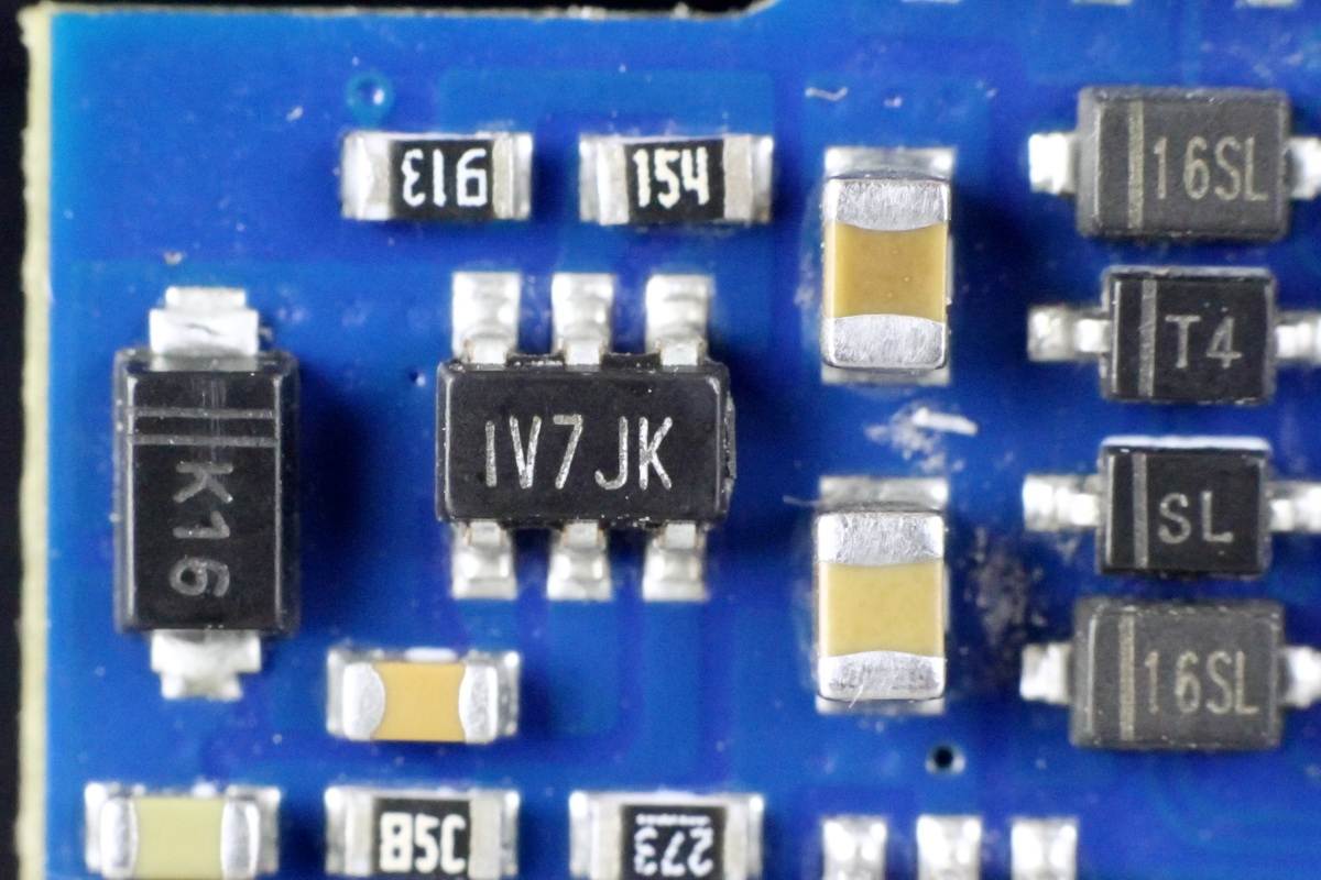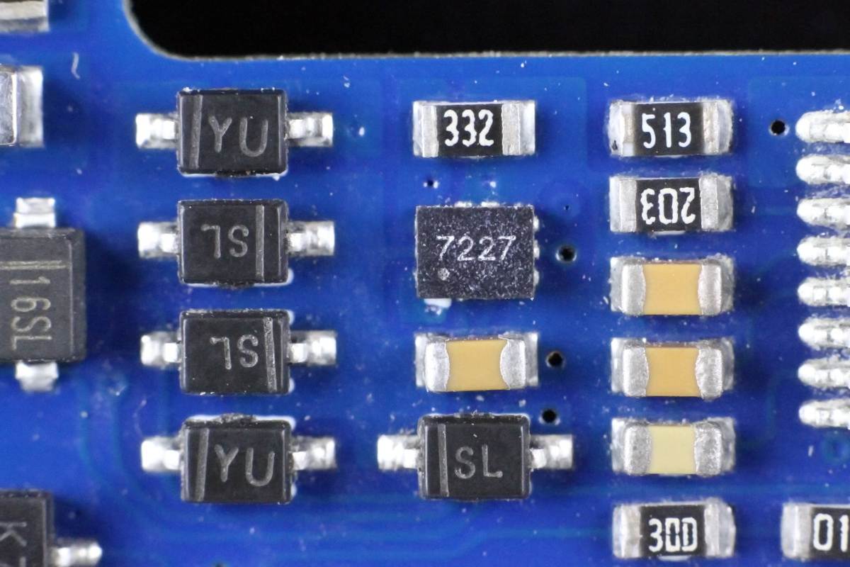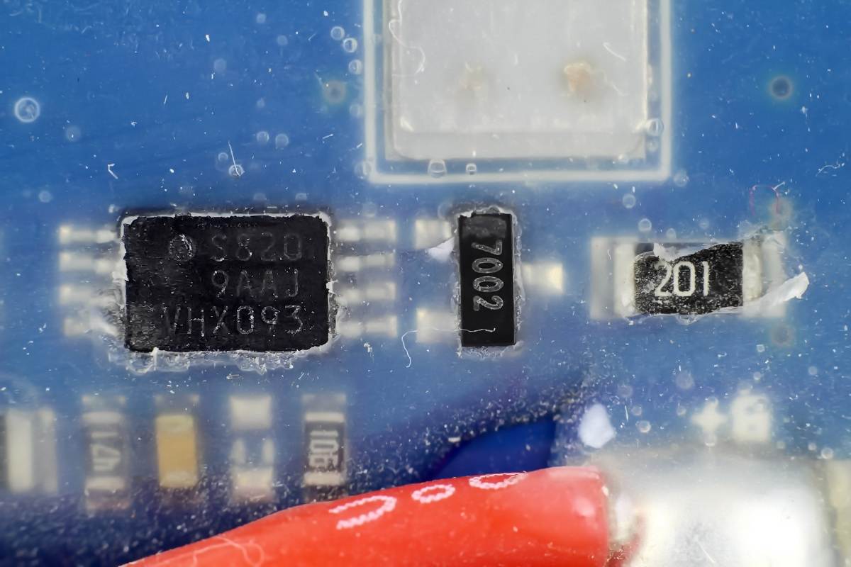 两颗NPO谐振电容特写和无线充电功率管特写,无线充电功率管采用SOT23封装。