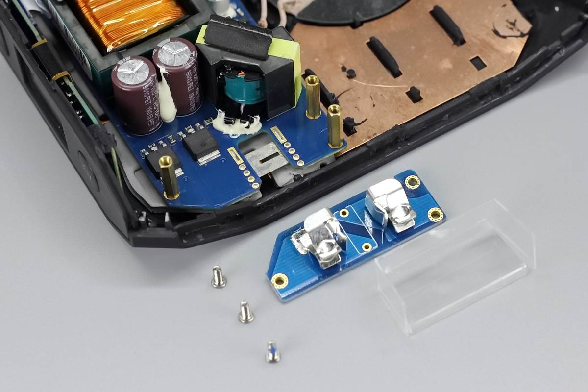 侧面AC插口小板使用金属柱和螺丝支撑固定,同时还有透明塑料壳进行隔离绝缘。