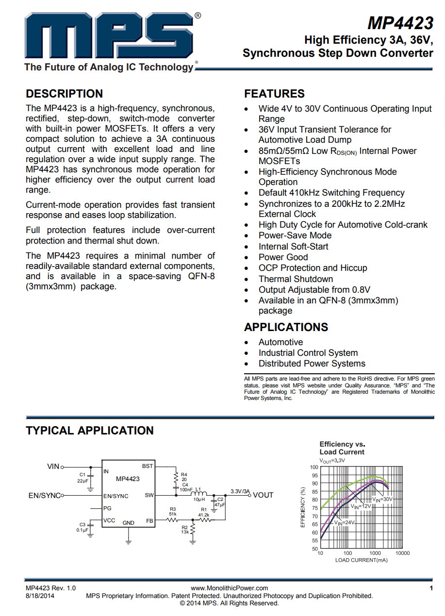 A口输出降压转换器特写,MPS MP4423,高效率同步整流降压转换器。