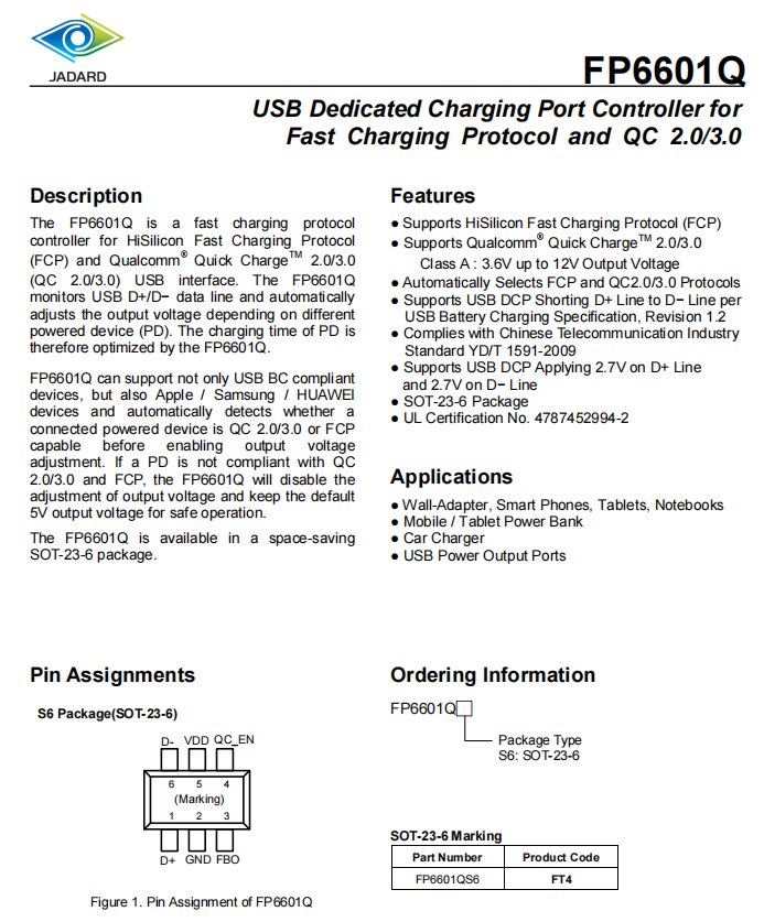 协议芯片采用天德钰FP6601Q,支持高通QC3.0/2.0与华为FCP,通过监控USB D+/D-上的电压数据自动调整供电设备上的输出电压,互相握手识别后设备提升充电功率缩短充电时间。在本身就支持QC3.0,QC2.0和FCP的情况下,还能自动识别APPLE、三星、BC1.2协议。