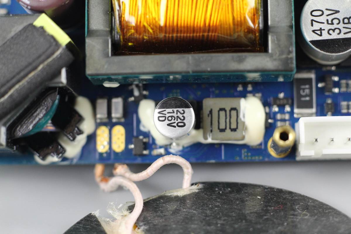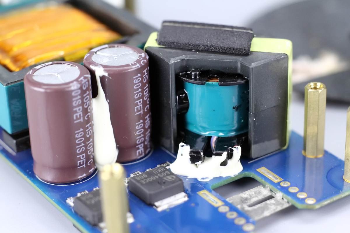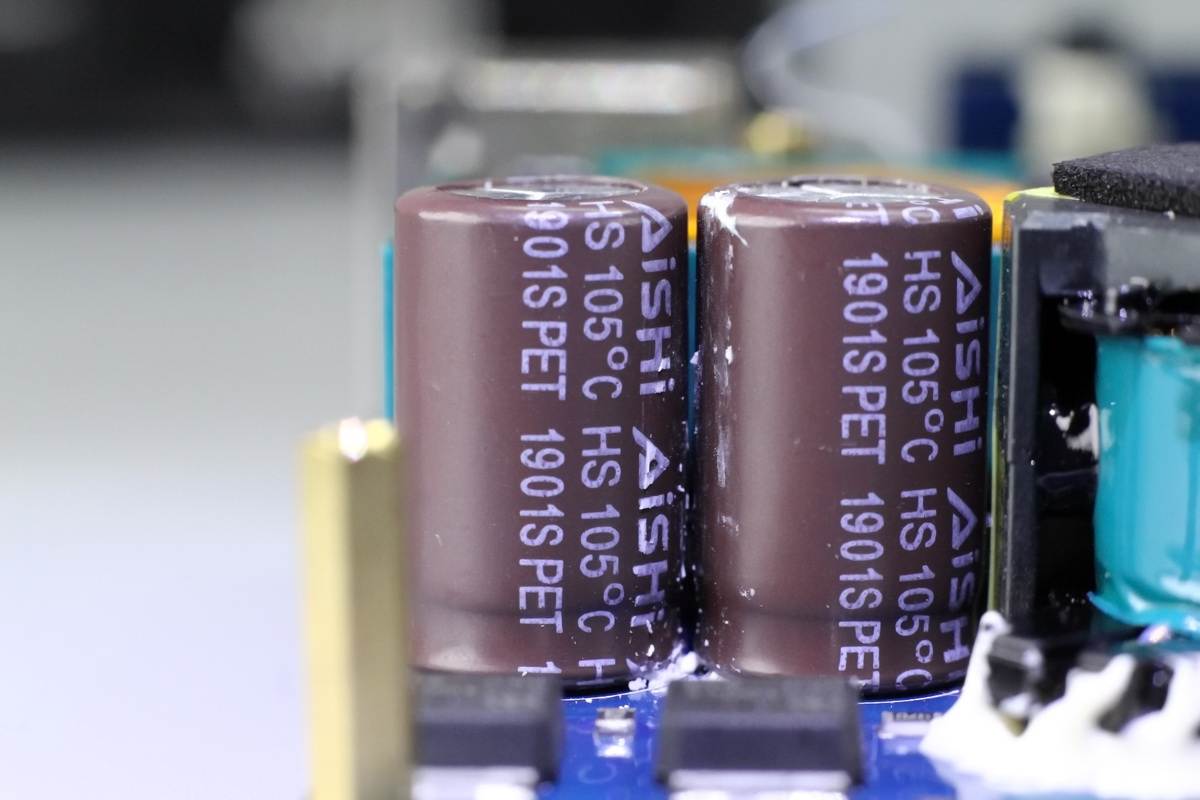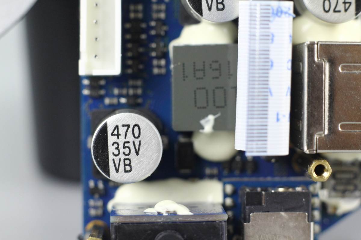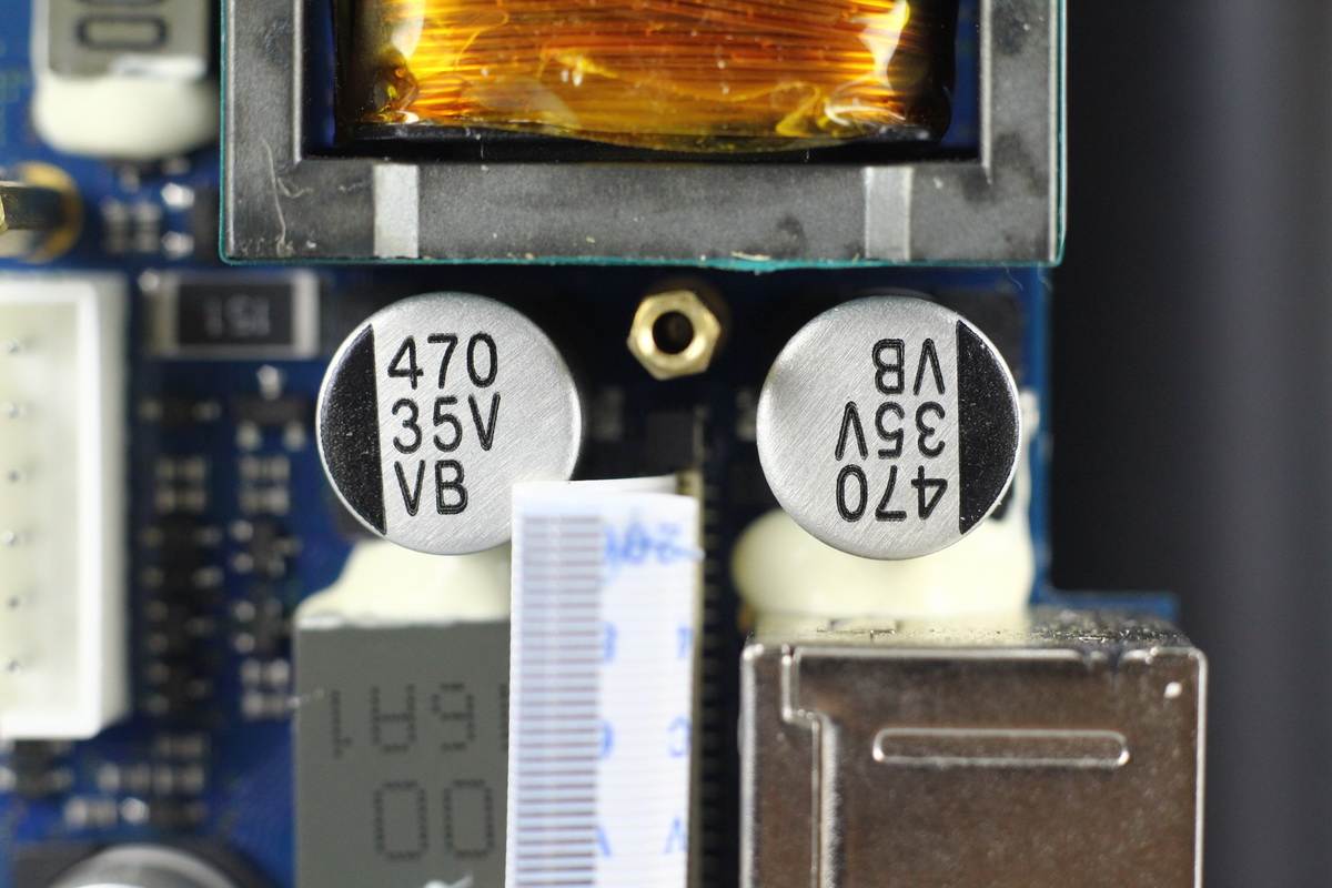 变压器一侧设有两颗输入滤波固态电容,规格都是35V 470μF。