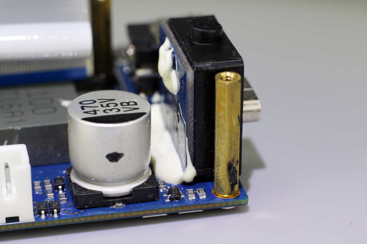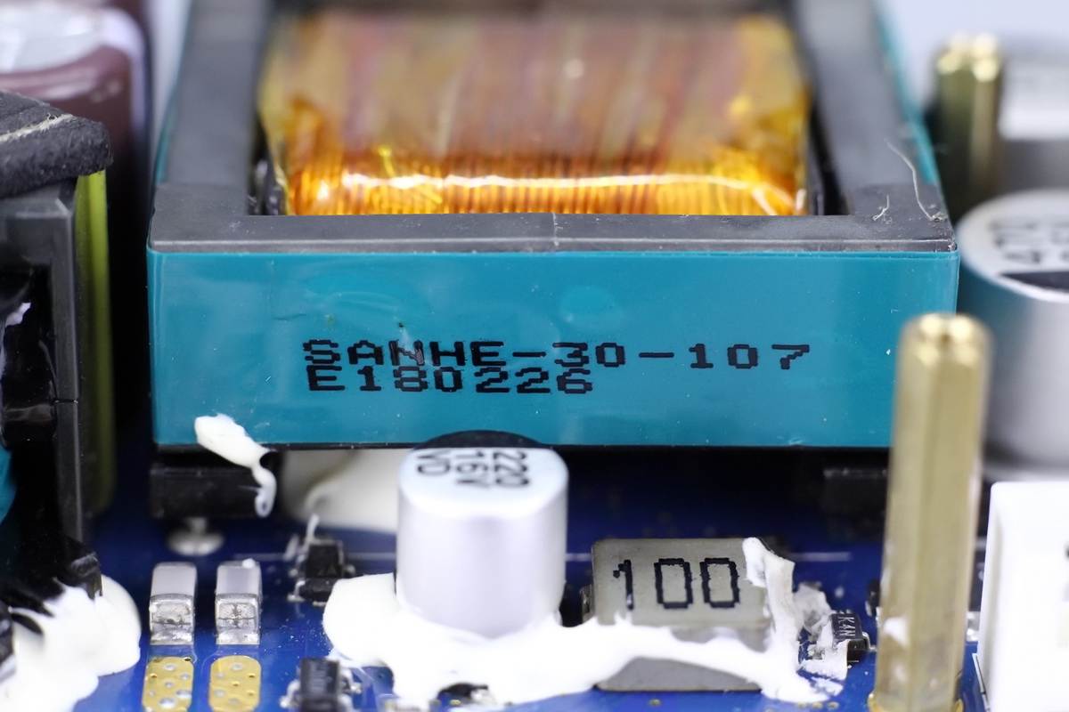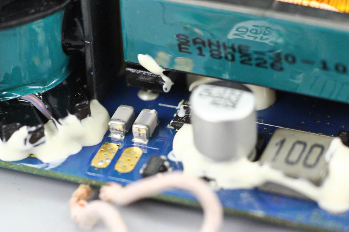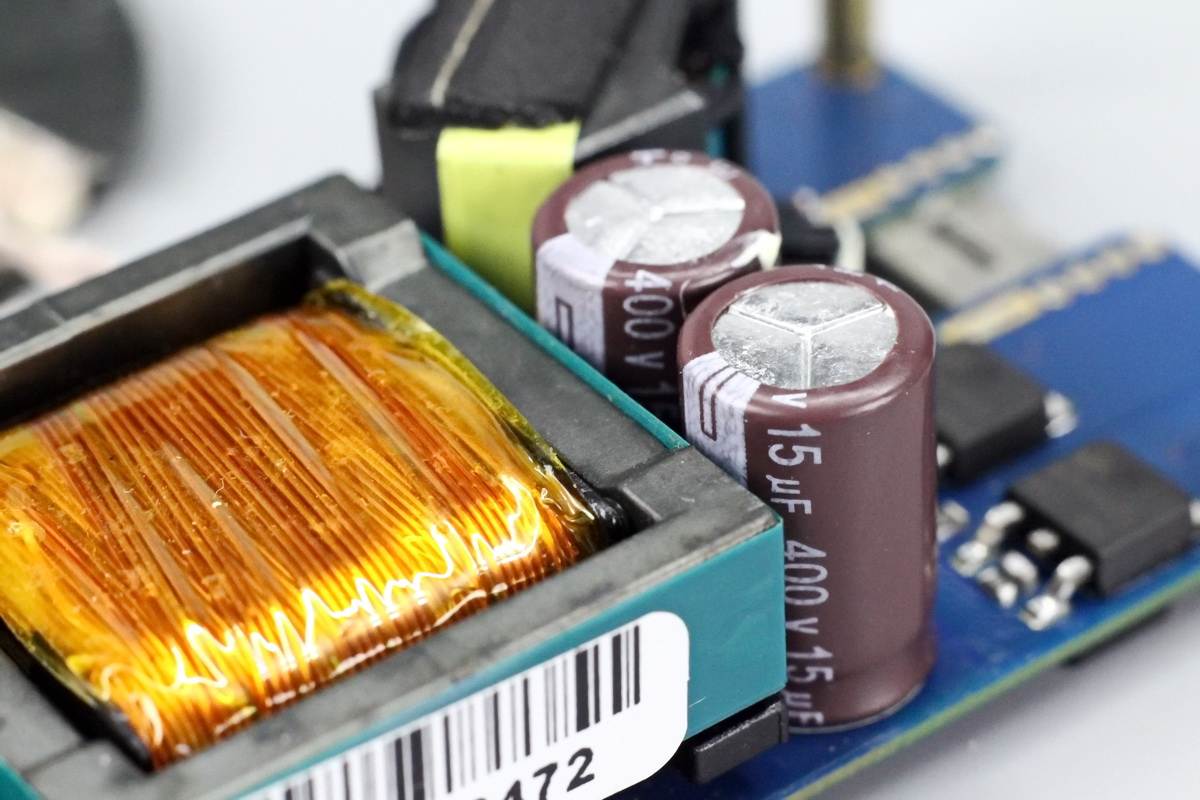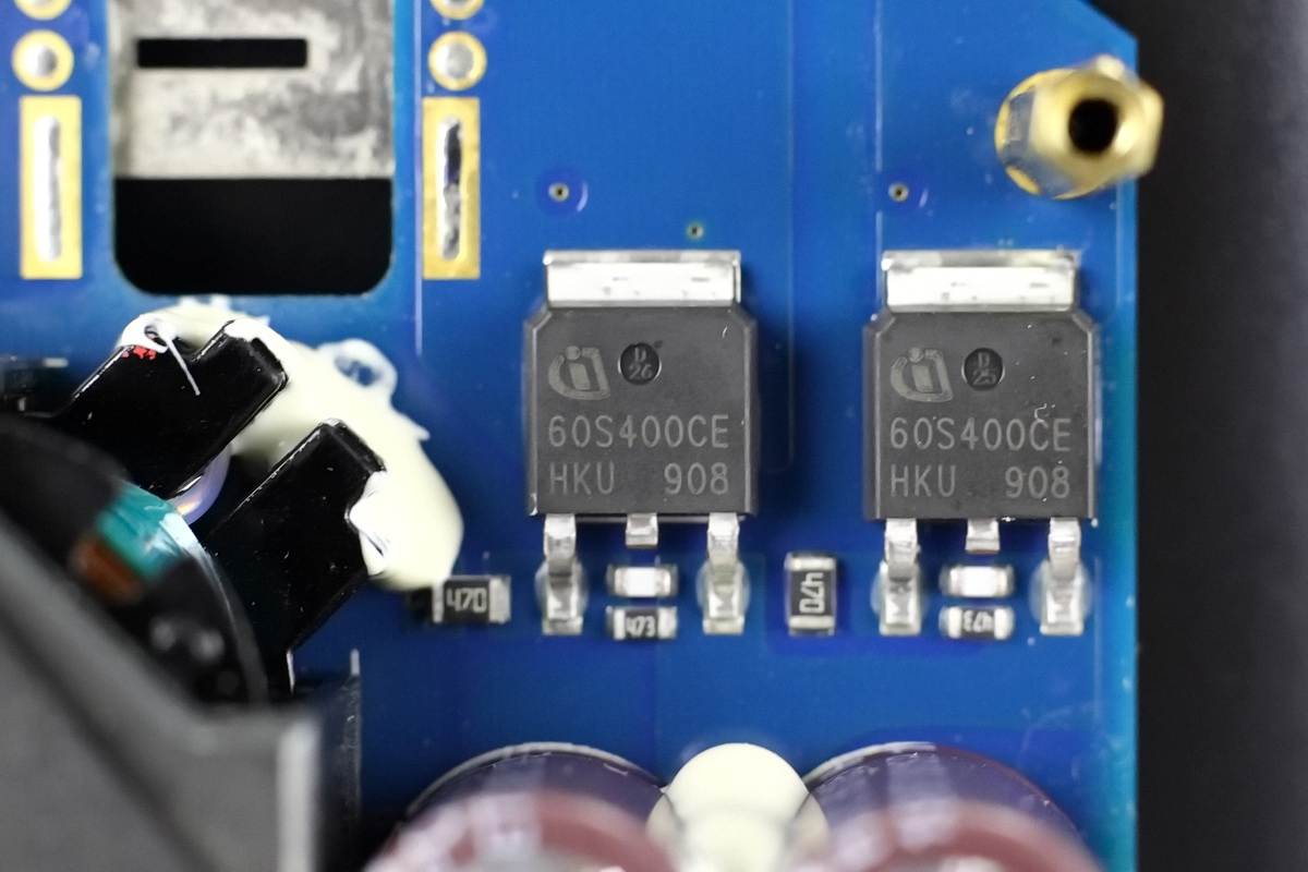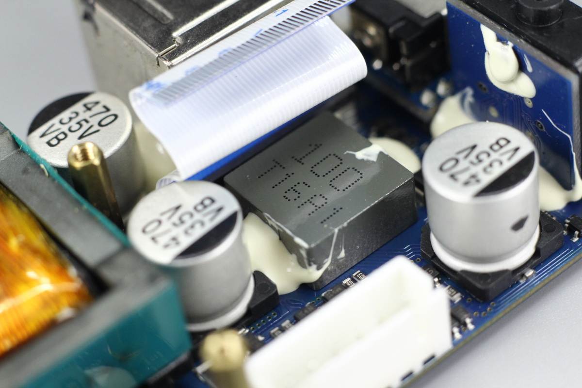 变压器一侧设有两颗输入滤波固态电容,规格都是35V 470μF。