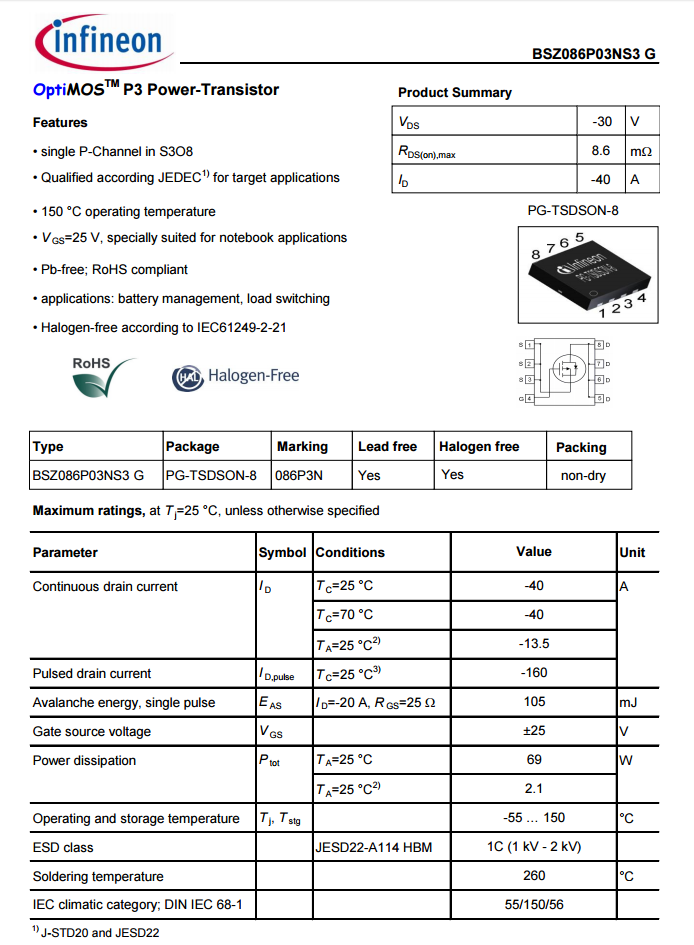 USB-C接口采用英飞凌两颗BSZ086P03NS3 G MOS管进行切换保护,耐压30V,导阻8.6mΩ,PG-TSDSON-8封装。