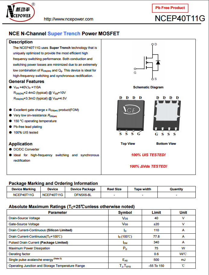 另外四颗MOS管是新功率NCEP40T11G,耐压40V,DFN5x6-8L封装。