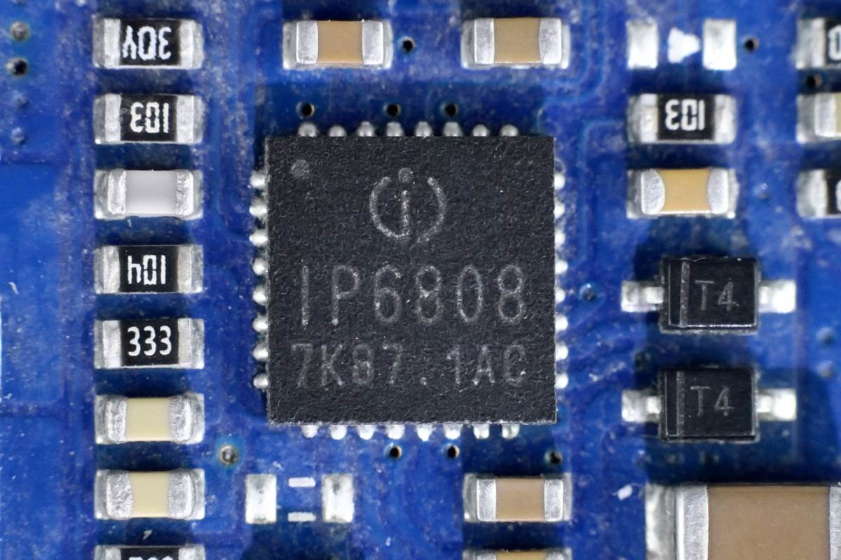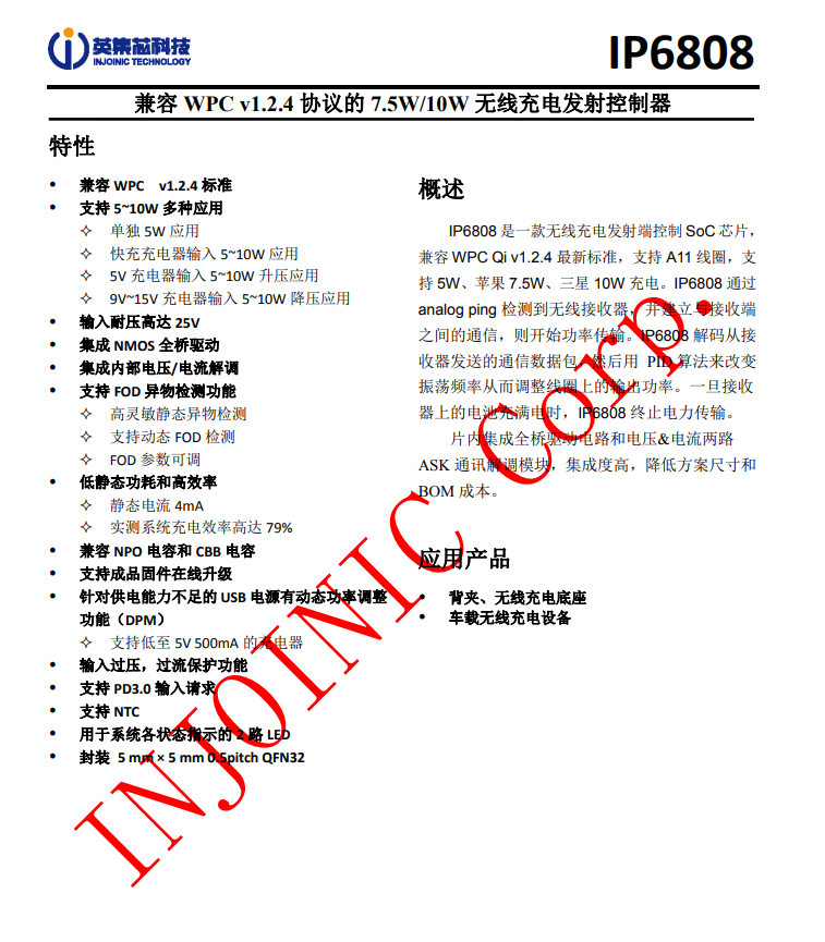 无线充主控芯片采用英集芯IP6808。这是一款无线充电发射端控制SoC芯片,兼容WPC Qi V1.2.4最新标准,支持A11线圈,支持5W、苹果7.5W、三星10W无线充电。IP6808内集成全桥驱动电路和电压&电流两路ASK通讯解调模块,集成度很高,有效帮助降低方案尺寸和BOM成本。
