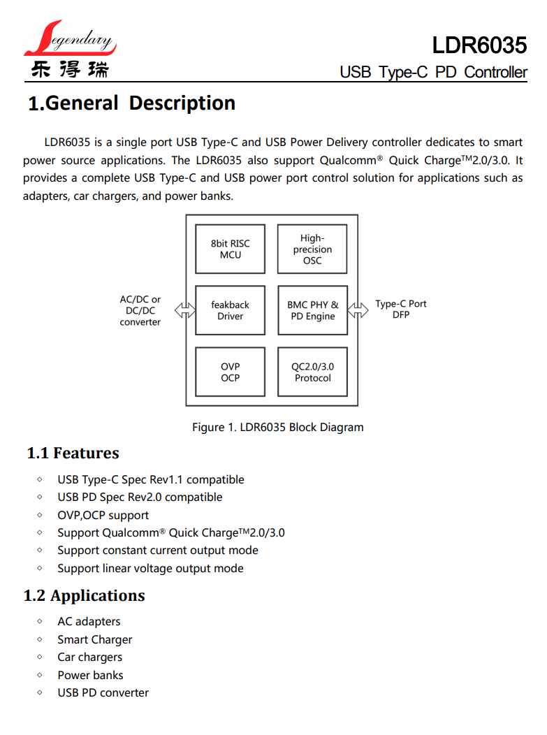 乐得瑞 LDR6035,单口USB-C控制器,支持QC2.0/3.0,是完整的USB-C接口解决方案,适用于充电器、车充、移动电源。