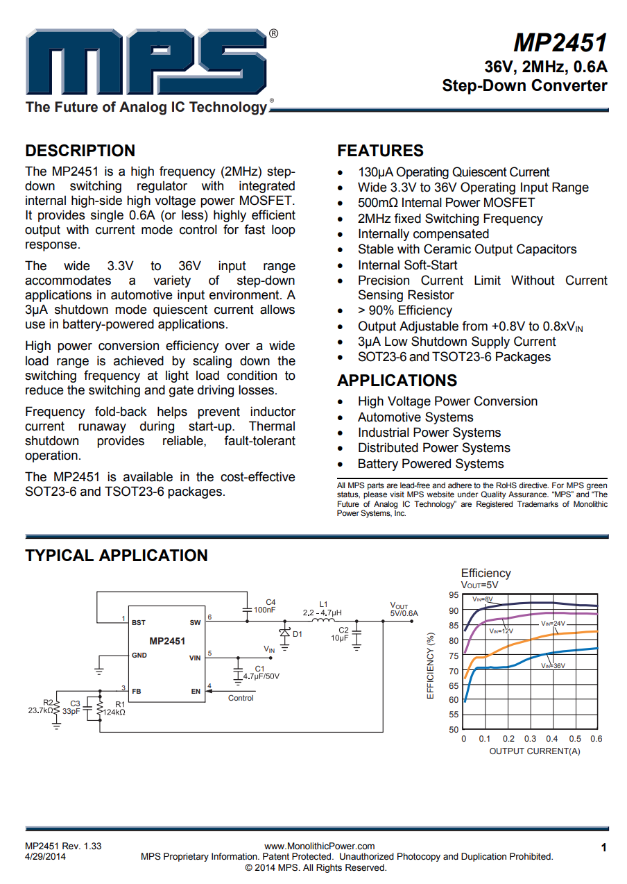 MPS MP2451 36V输入的降压转换器,内置开关管,用于为MCU供电。