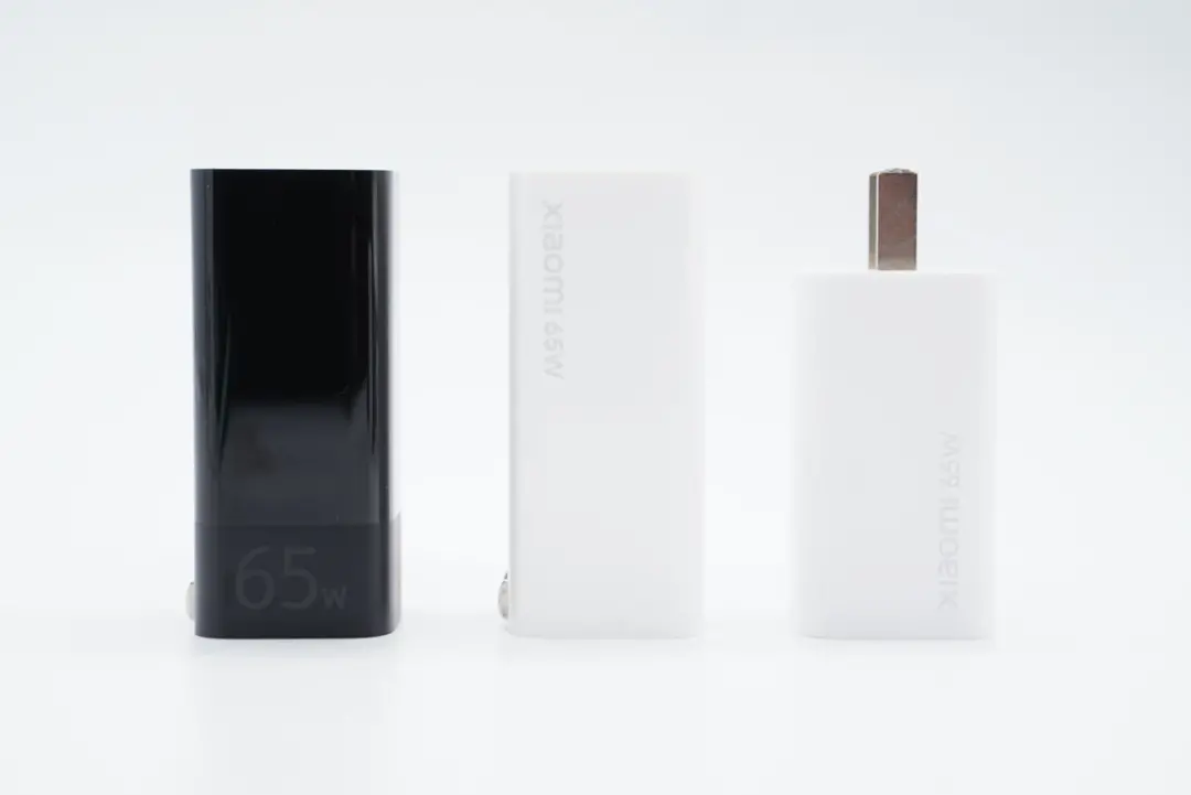 小米65W双口氮化镓充电器表面采用了亮面设计,并在侧面用浅灰色标注了xiaomi 65W的字样。插脚为折叠设计,够精致。
