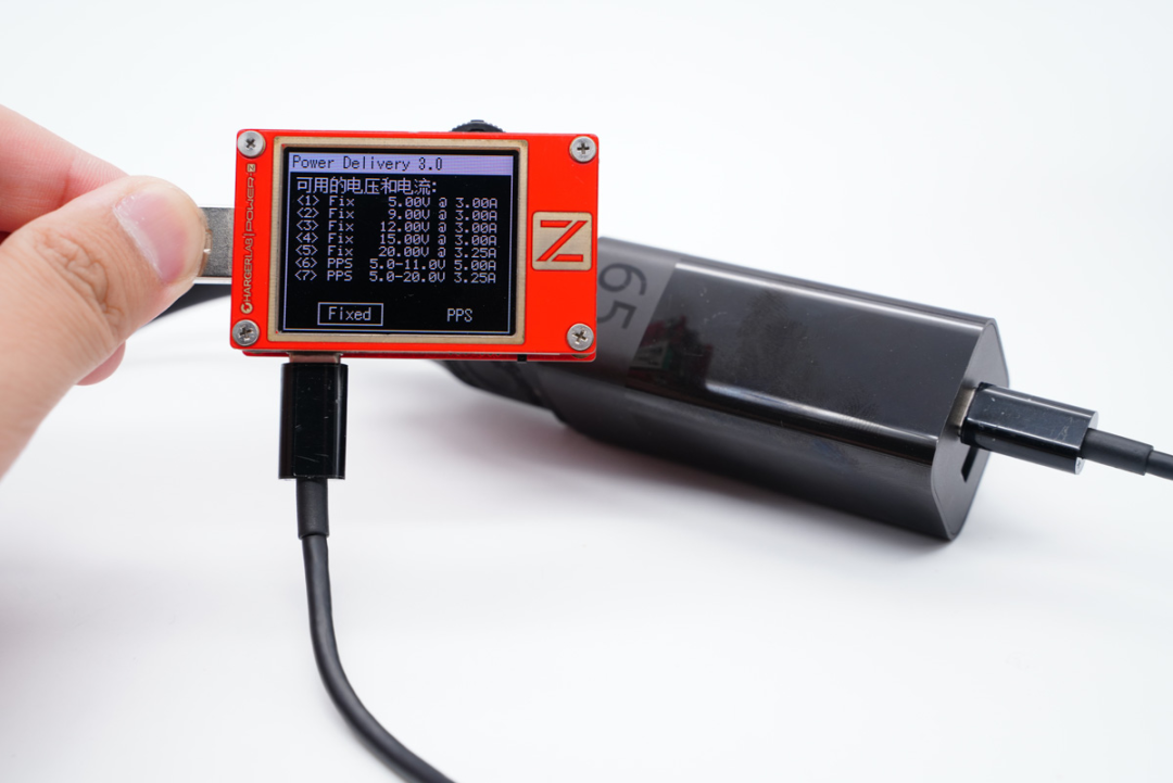 读取USB-C的PD输出档位,实测支持5V3A、9V3A、12V3A、15V3A、20V3.25A五个PD固定电压档位,此外还支持5-11V5A、5-20V3.25A两组PPS档位。