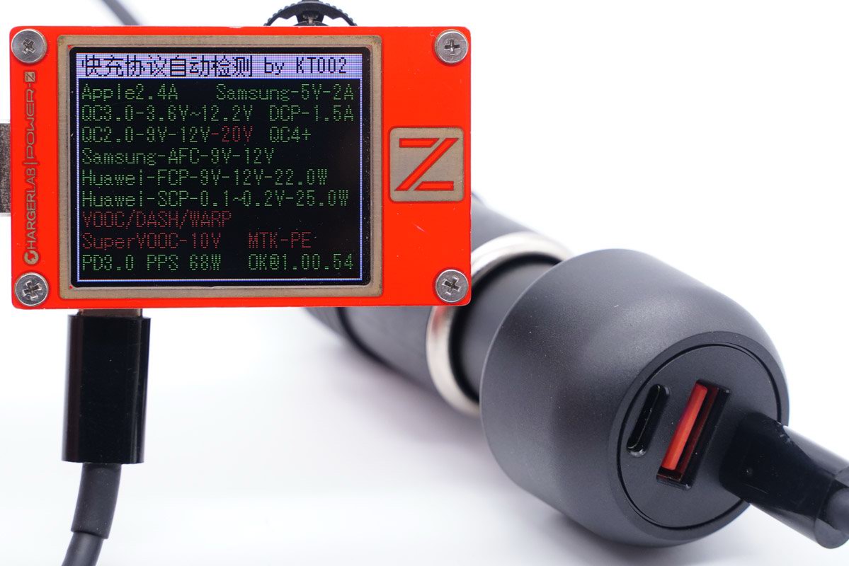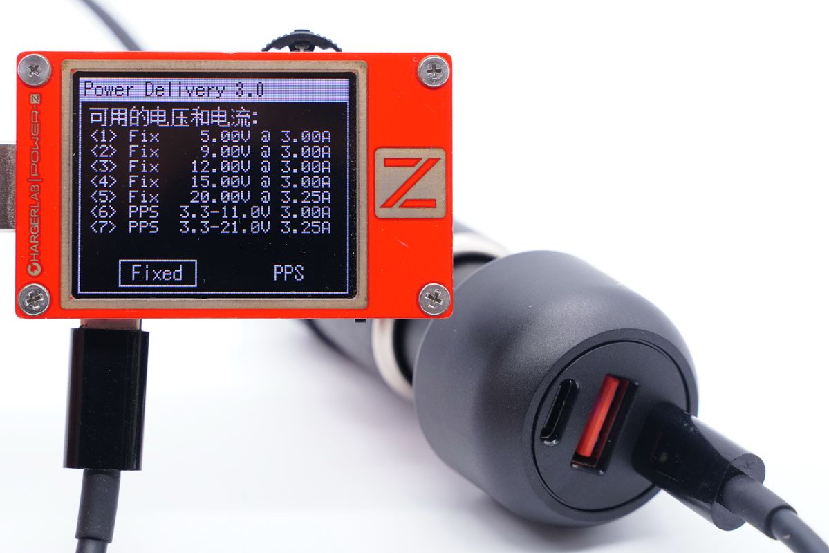 使用POWER-Z KT002 USB测试仪读取USB-C1 PDO报文,车载充电器基于PD3.0快速充电标准开发,带有5V3A / 9V3A / 12V3A / 15V3A / 20V3.25A五个固定电压输出,另外还带有3.3-11V3A / 3.3-21V3.25A两组PPS电压子集,丰富的PDO电压,可以满足绝大部分主流设备使用。