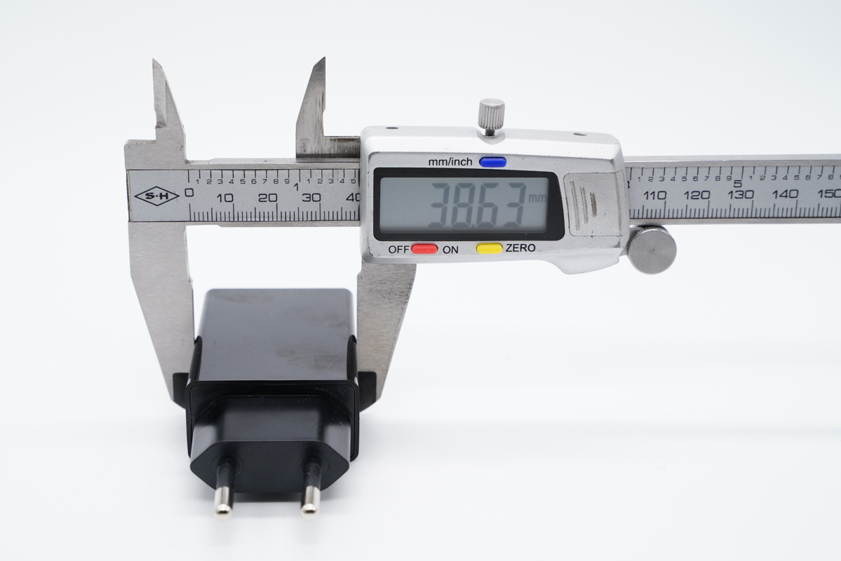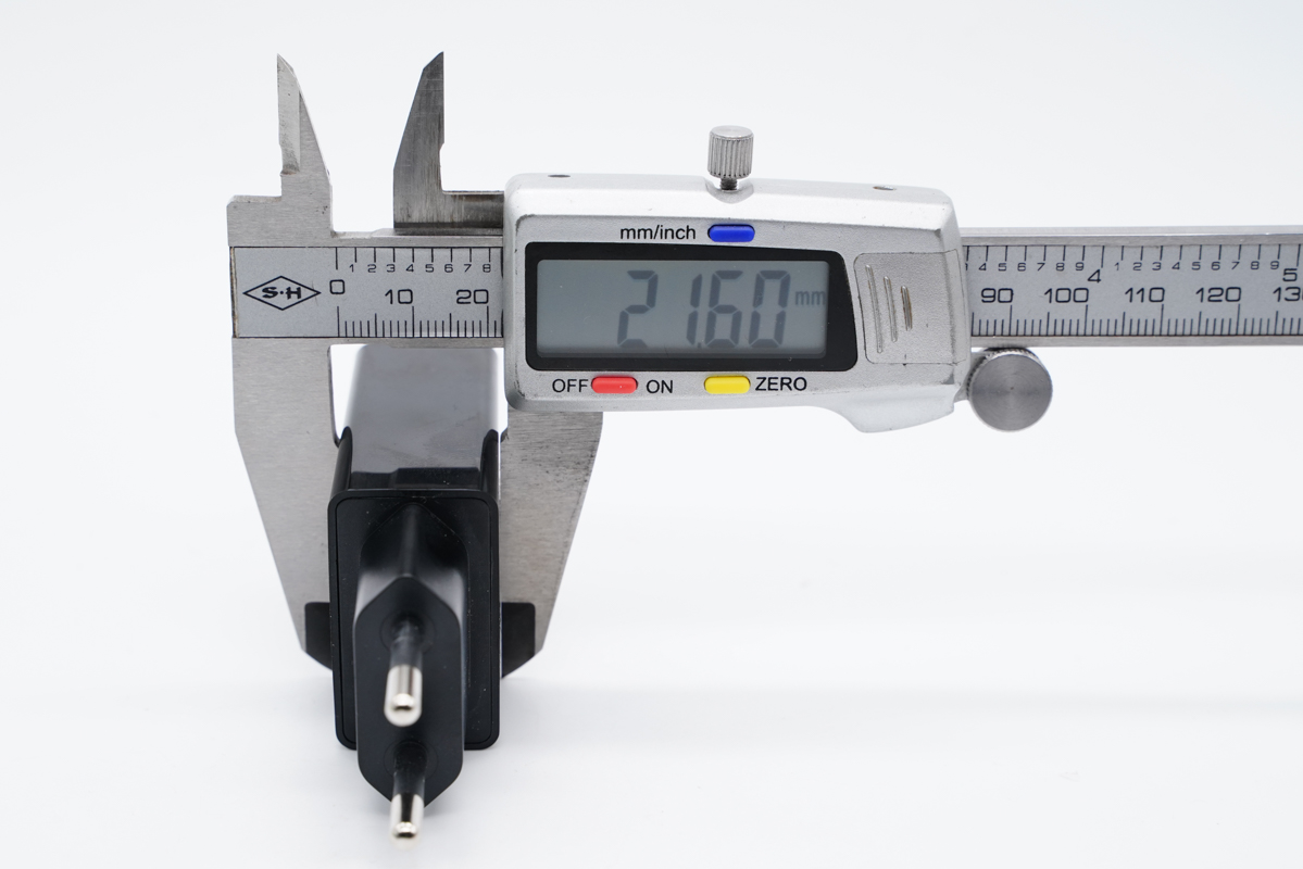 使用游标卡尺实测充电器机身总长度约为66.59mm。