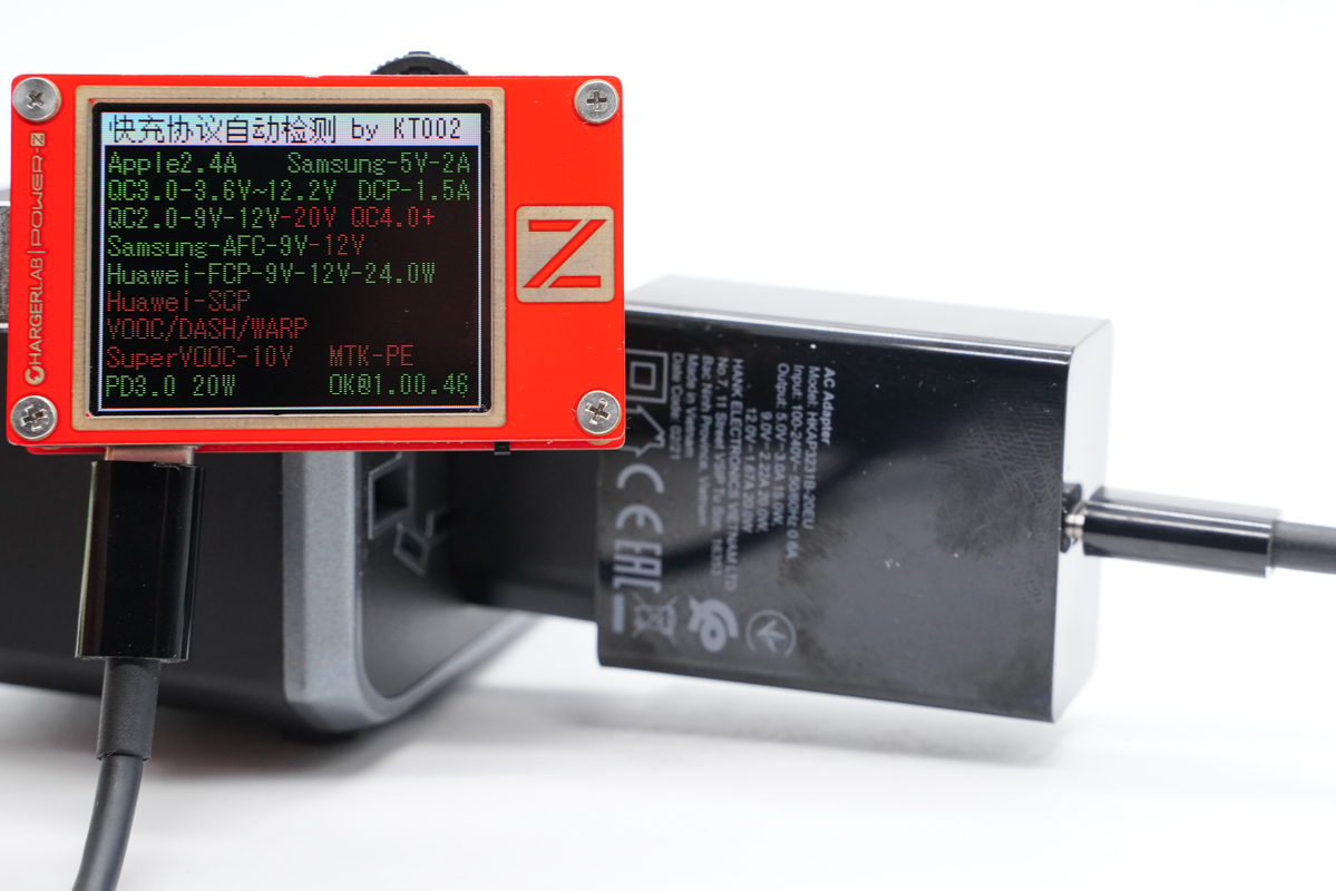 使用ChargerLAB POWER-Z KT002检测USB-C口输出协议,显示支持Apple 2.4A、Samsung 5V2A和DCP协议,以及QC2.0/3.0、AFC、FCP、PD3.0快充协议。