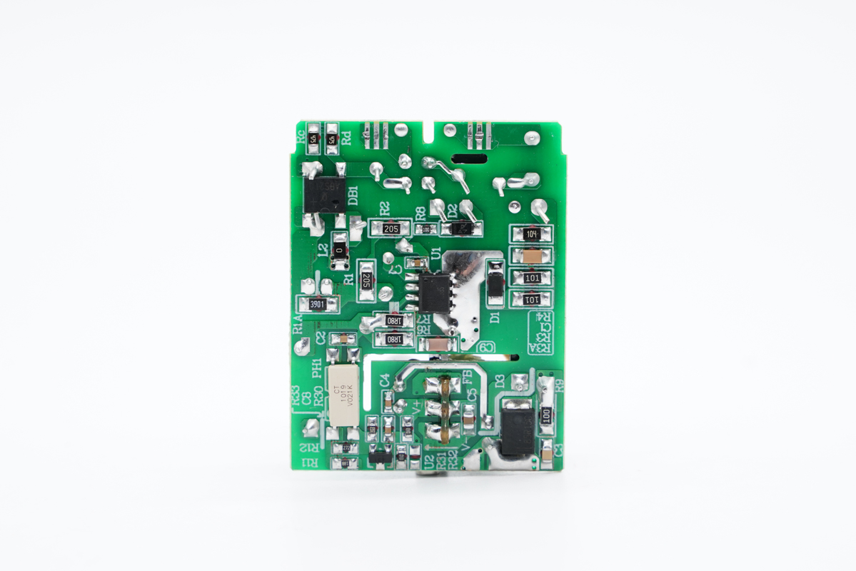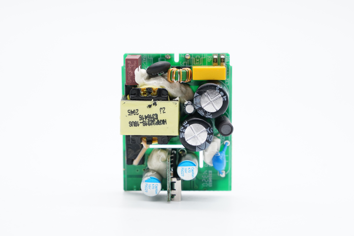 PCB板背面一览,白色光耦横跨在初次级之间,此外还有整流桥、主控芯片、次级同步整流芯片。