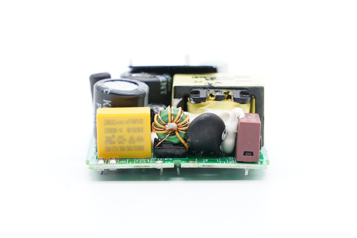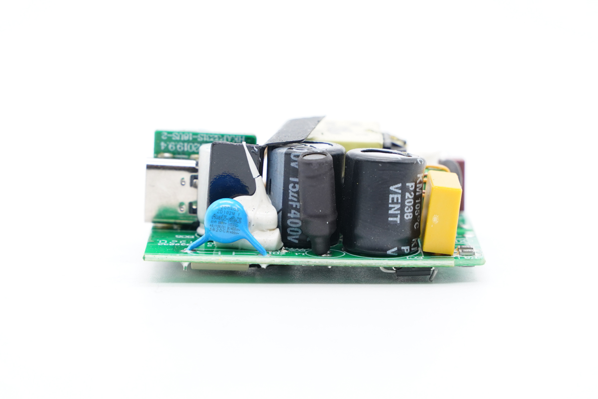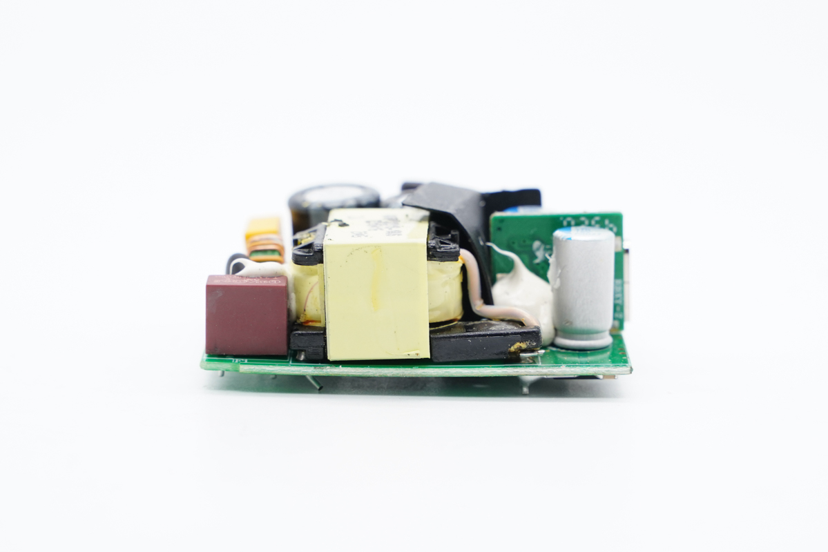 PCB板侧面一览,这一侧设有工字电感、两颗高压滤波电解电容以及一颗Y电容。