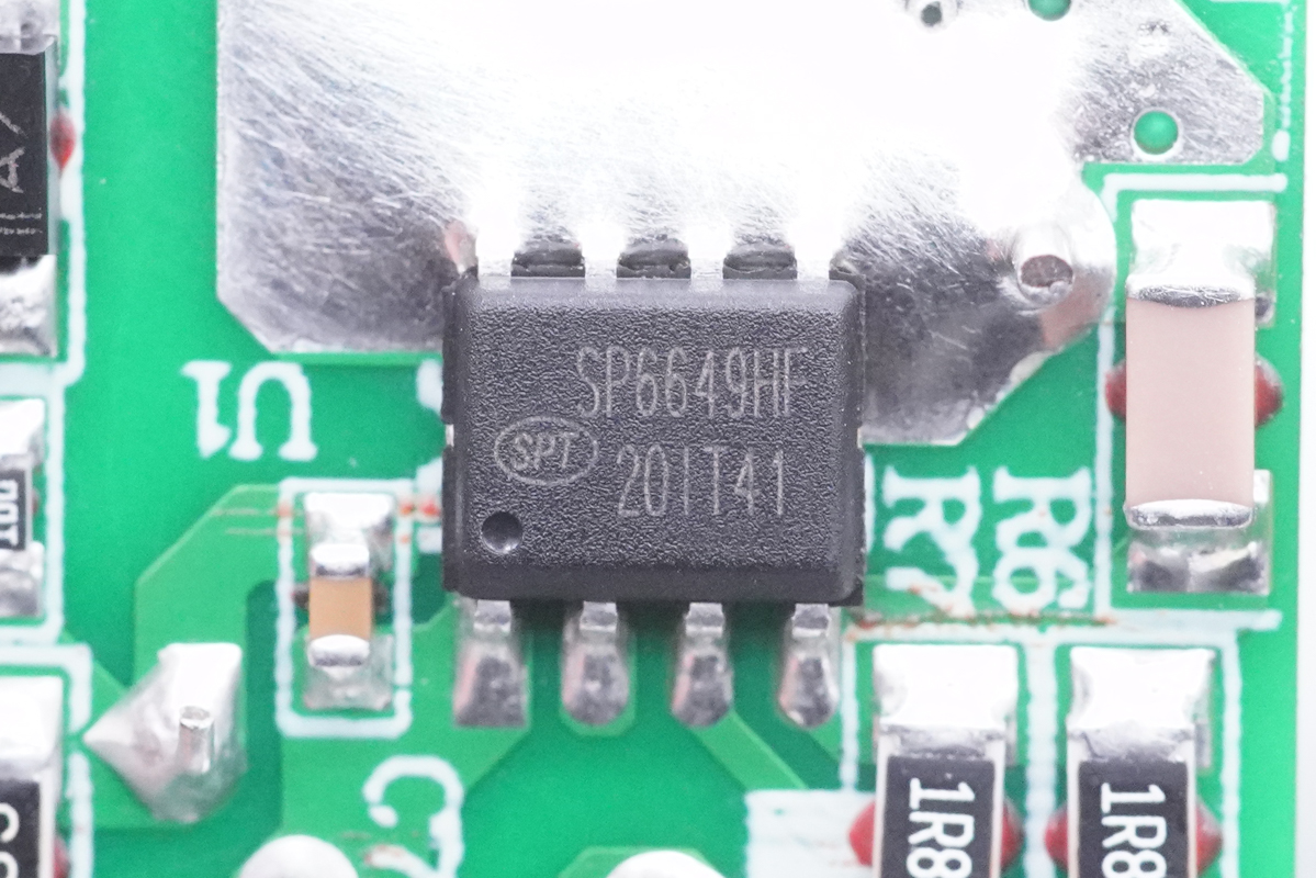 开关电源主控芯片采用硅动力SP6649HF,这是一颗电流模式PWM控制芯片,内置650V高压功率MOSFET,应用于功率在30W以内的方案,固定65KHz开关频率,内置抖频功能用于改善EMI性能,跳频模式提高轻载效率,降低待机功耗。同时内置多种完善的保护功能,全功率范围无音频噪声,采用SOP8封装,芯片焊盘大面积露铜加锡散热。