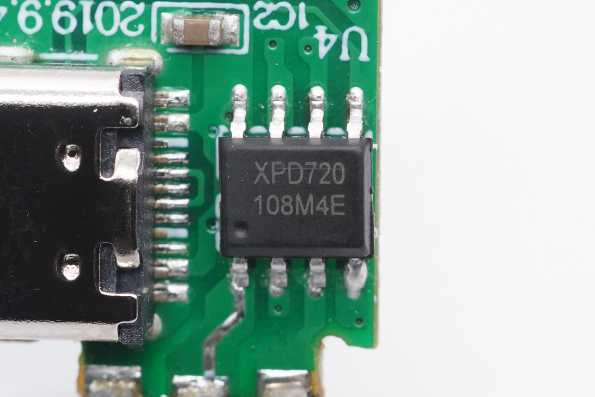 USB PD协议芯片采用云矽半导体XPD720,这款芯片已经通过了USB PD3.0认证,TID:3479,支持QC2.0、QC3.0、AFC、FCP、SCP、HVSCP、PD和PPS等快充协议,内部集成 10mΩ VBUS 通路功率开关管,并且集成10mΩ电流检测电阻,支持完善的保护功能,节省外围元件数量,简化电路,降低成本。采用ESOP8封装。