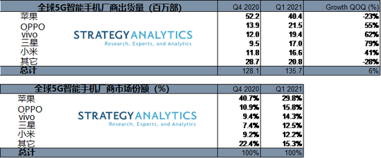 根据 Strategy Analytics 发布的2021年第1季度全球5G智能手机出货量报告,不难发现,随着苹果发布会的新机潮过去,iPhone 出货量逐步走低,OV、三星、小米的新机不断炒热市场,相比上季度节节攀升。