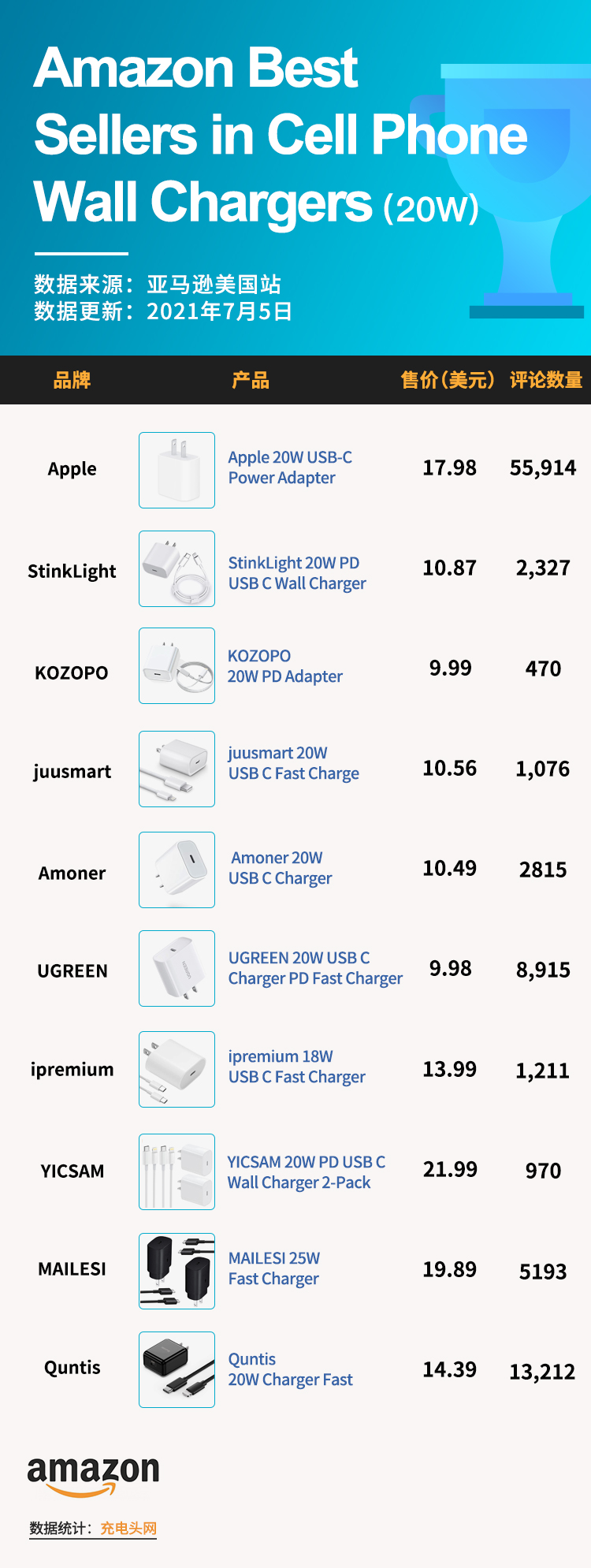 闲话说完,上榜!首先是 Amazon亚马逊 官方的20W充电器品类“Best Sellers”榜单,每小时更新。数据取自于7月5日,文章就以当时的数据统计为准。