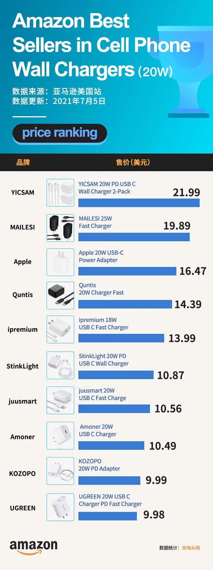 这十款充电器以单价计算,苹果20W PD充电器以16.47美元位居首位。价格最低的则是绿联的9.98美元,绿联作为这里面的老牌充电器厂商,产品质量过硬,价格却最低,可能和不附赠充电线有关。