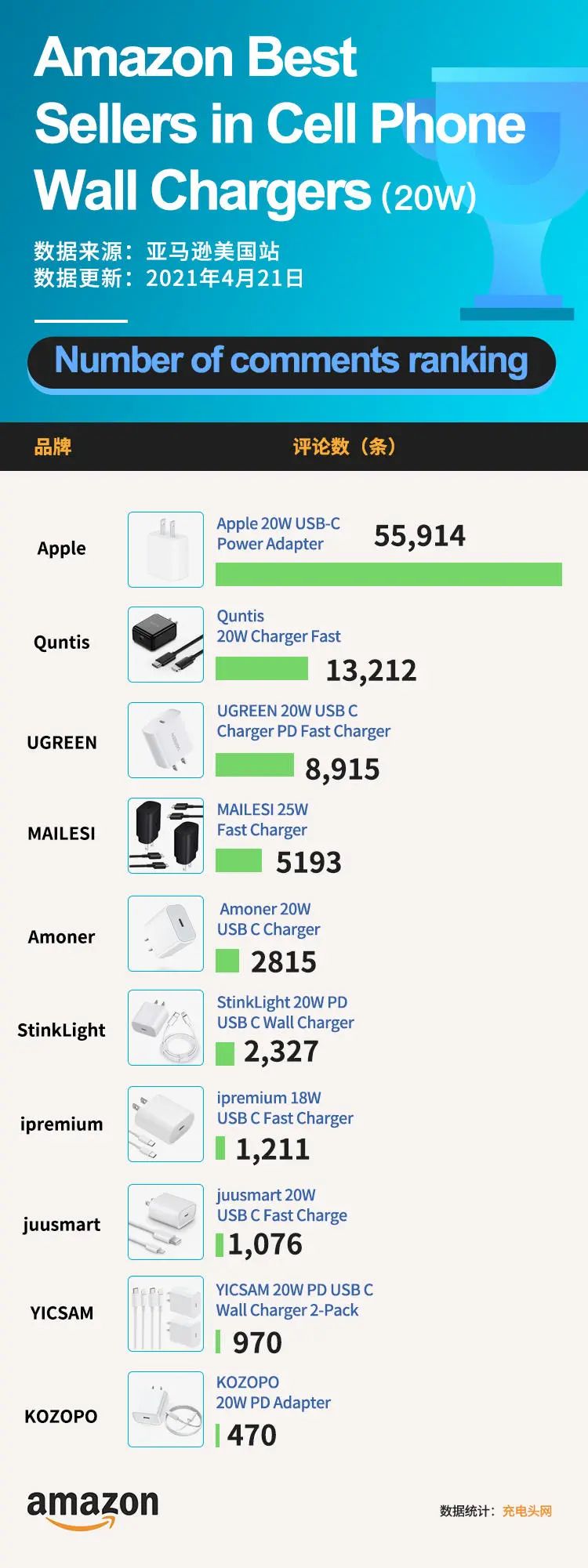 最后就是评分了,苹果自然位居榜首,后面就是KOZOPO、Amoner、绿联、MAILESI,评分都在4.7分。Stinklight、juusmart、ipremuin、Quntis这几款充电器评分来到了4.5分,相对表现一般。