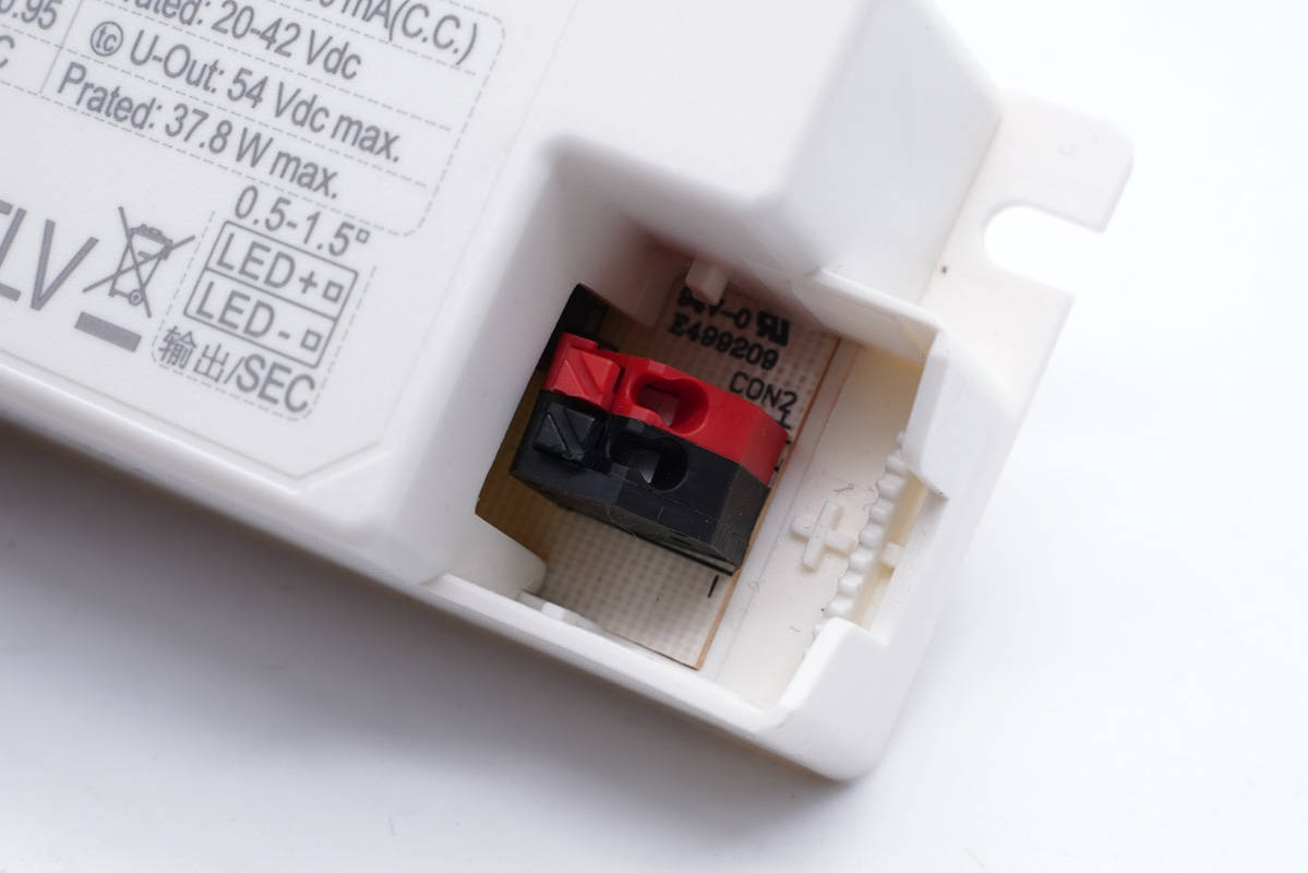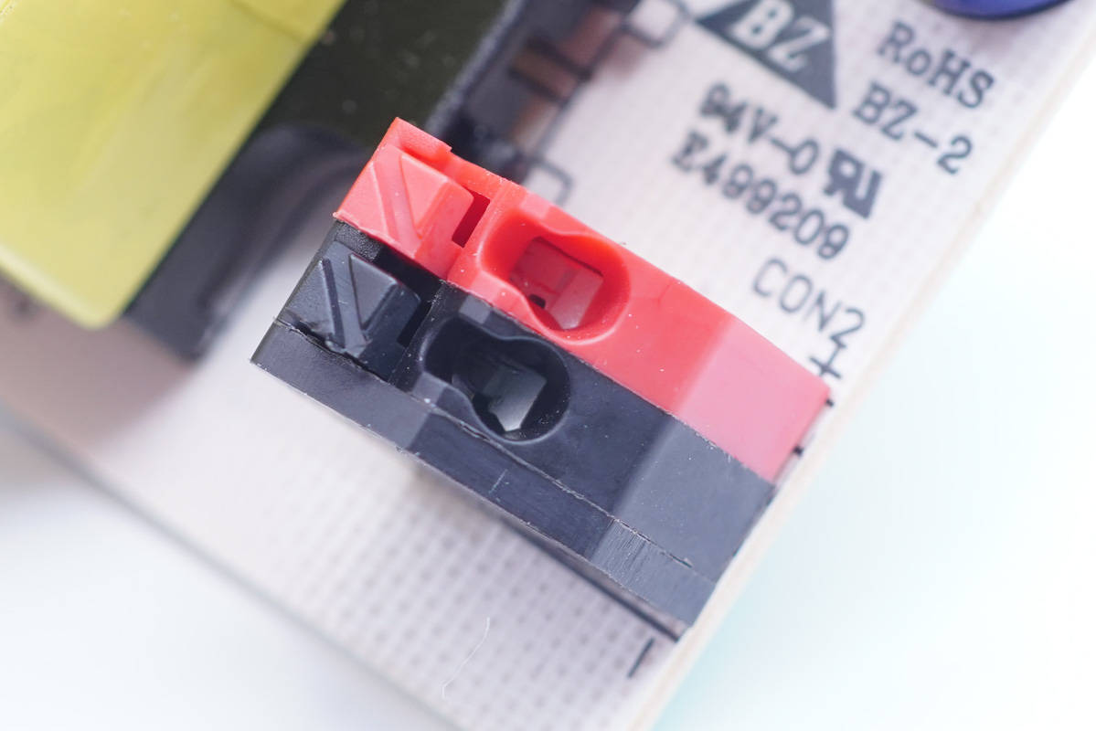 输出接线母座特写,使用压接端子,红黑色区分正负极。