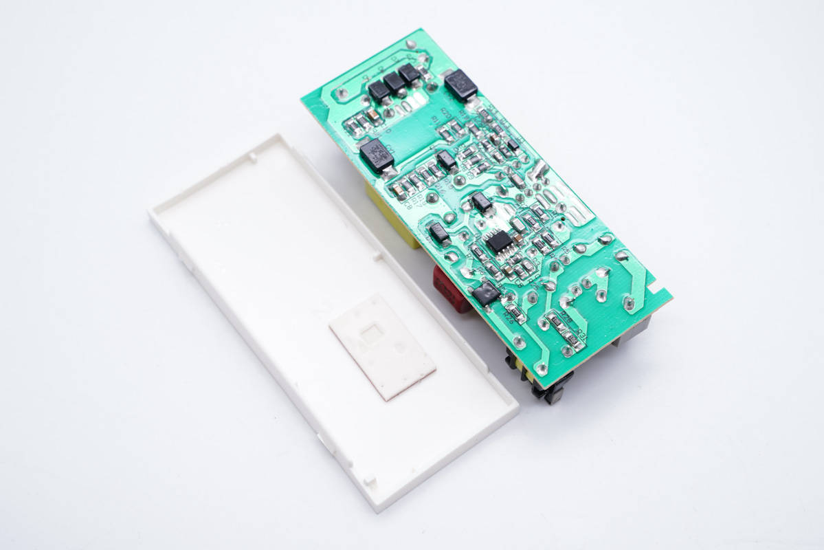 塑料壳对应主板背面PFC升压控制器处有导热垫,帮助发热器件散热。