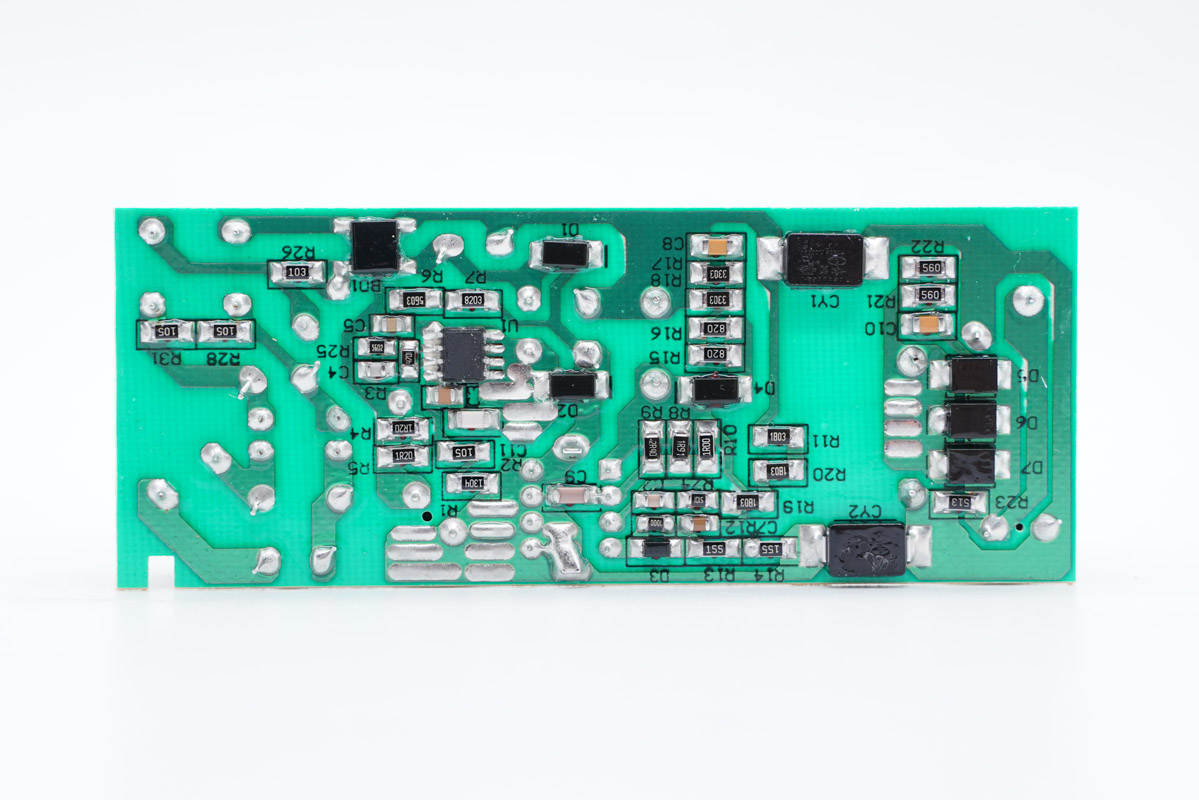 主板背面一览,初级侧设有整流桥和PFC升压控制器,两颗贴片Y电容横跨初次级,输出端采用快恢复二极管整流输出。