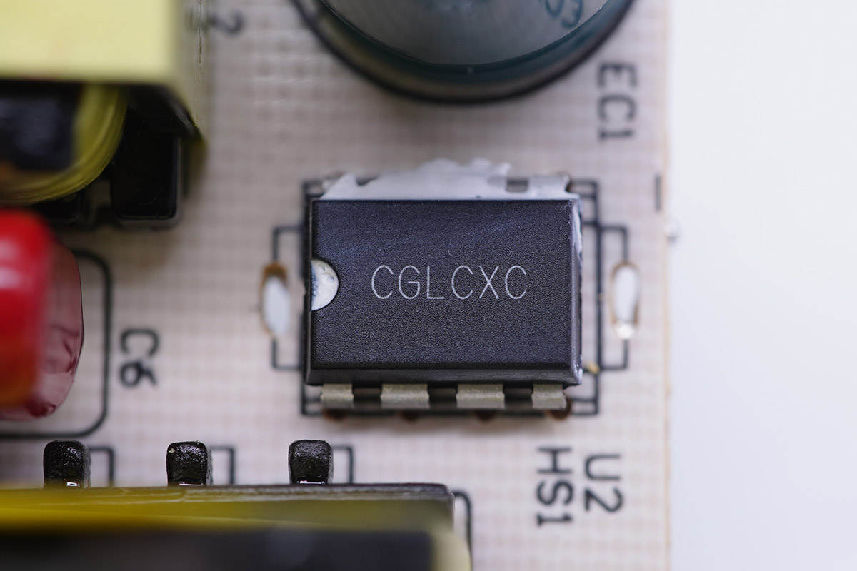 LED驱动芯片为矽力杰SY58237,顶部焊接散热片。采用准谐振反激拓扑,内置650V NMOS,采用专有的浮动开关设置,无需光耦和辅助线圈反馈,具有可靠的LED短路和开路保护,支持热折返,采用DIP8封装。