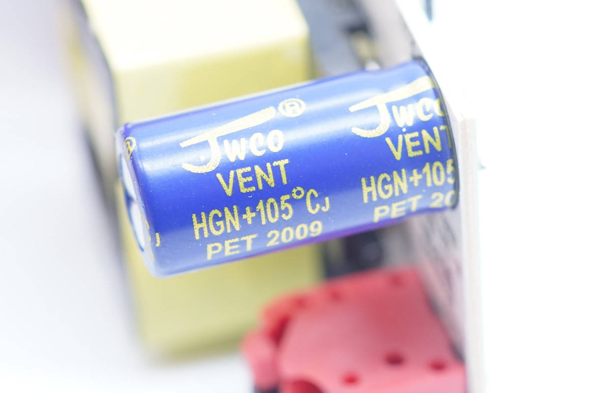 红色薄膜滤波电容特写,一共两颗且都一样。