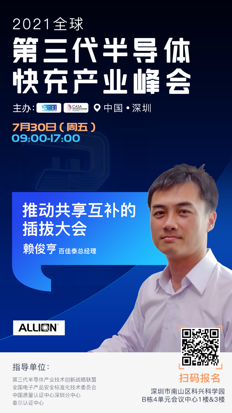 百佳泰从四大领域提供专业的服务:研究、设计、验证与量产,服务范围包含标准认证与测试、制订质量标准、规划量测方法、应用生态情境模拟与验证、设计治具以及IIOT物联网解决方案。百佳泰出席2021全球第三代半导体快充产业峰会并发表演讲!