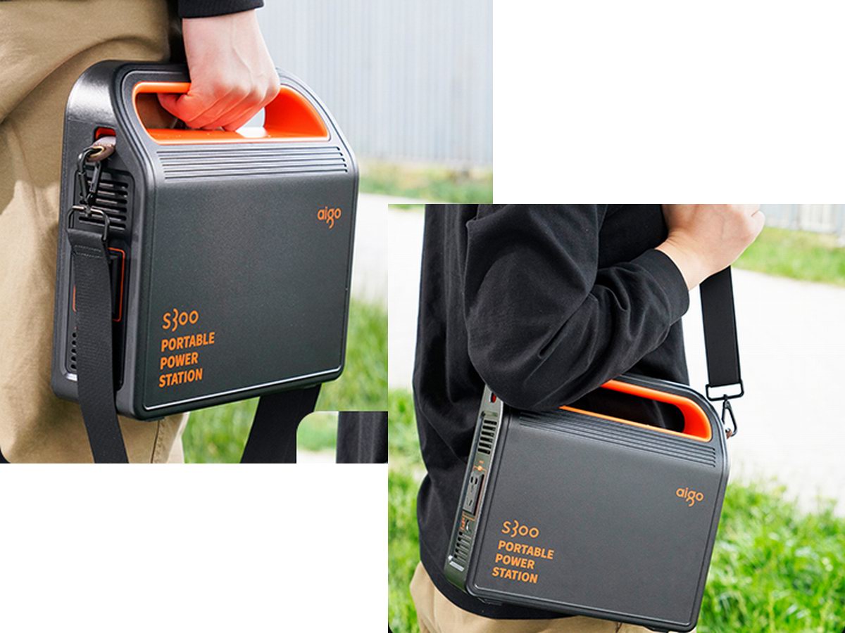 aigo S300户外电源公文包的外形顶部带有提手设计携带十分方便,并且两侧预留了扣具孔位,与配套的背带组合可减轻长时间携带的不适,方便用户携带出行。
