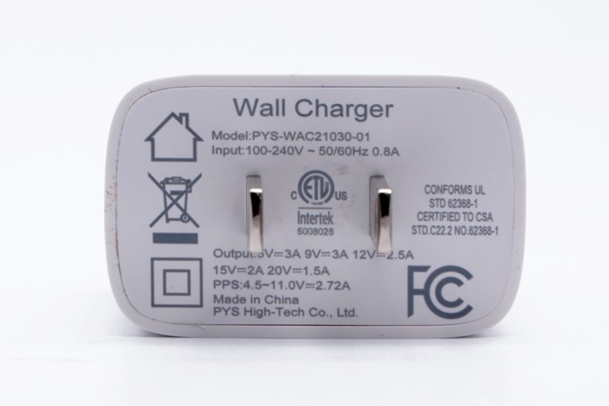 铭牌参数方面,型号:PYS:WAC21030-01,输入:100-240V ~ 50/60Hz 0.8A,输出:5V3A / 9V3A / 12V2.5A / 15V2A / 20V1.5A,PPS:4.5-11V2.7A。产品通过了ETL、FCC等认证。