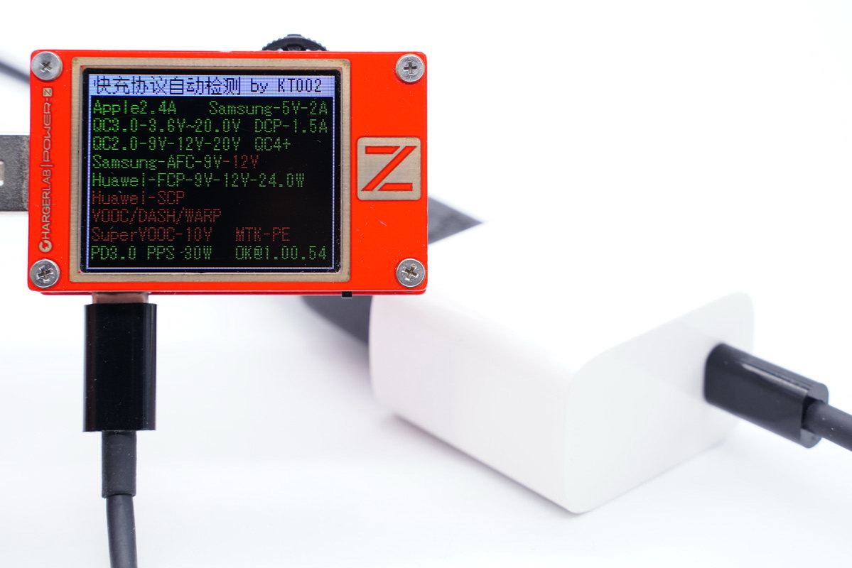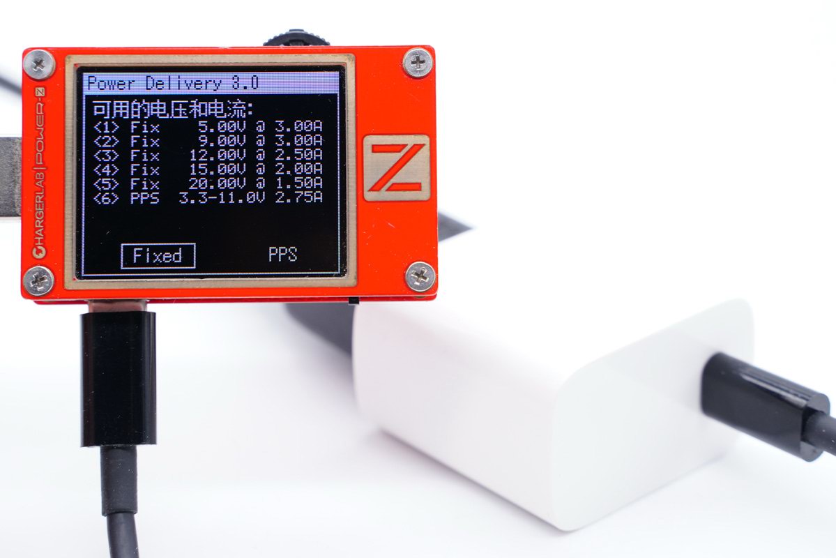 使用POWER-Z KT002 USB测试仪读取PDO报文,充电器基于PD3.0快速充电标准制作,带有5V3A / 9V3A / 12V2.5A / 15V2A / 20V1.5A五个固定电压输出档,另还带有3.3-11V2.75A一组PPS电压子集。