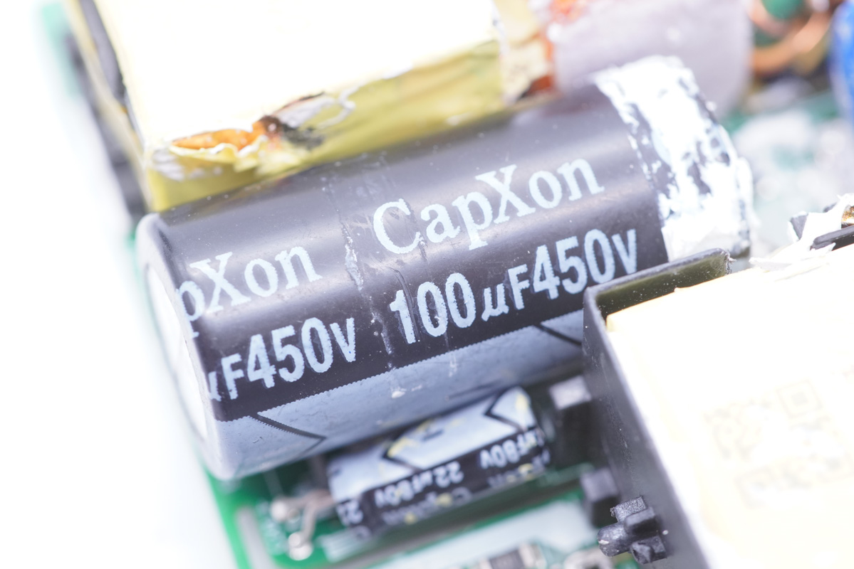 从布局上看,主板左侧设有输入滤波整流以及PFC升压电路器件;中间横置一颗高压滤波电解电容,外套胶套保护;右侧是变压器以及输出滤波电容等。