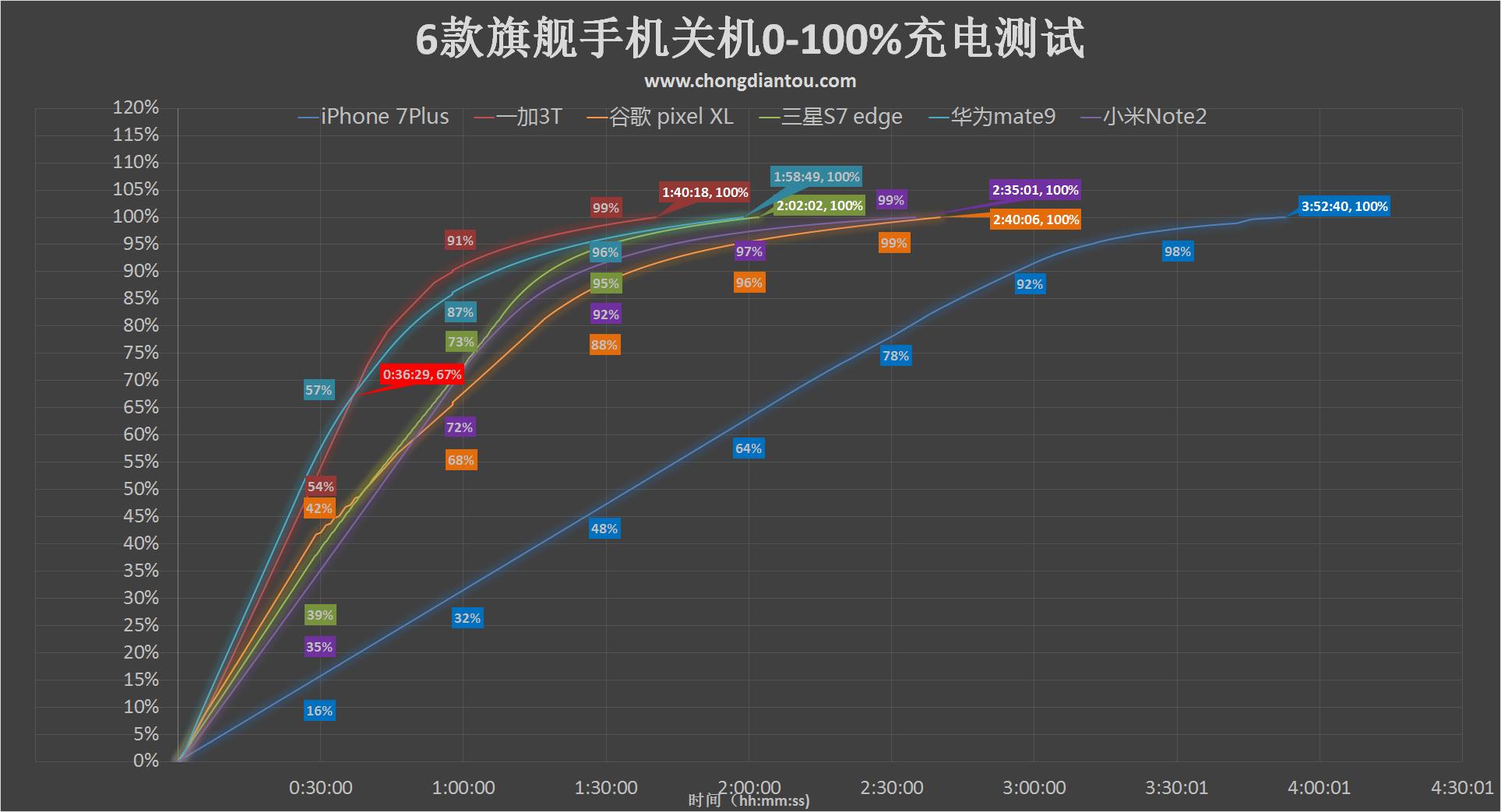 排在第3、4、5位的分别是三星S7edge、小米Note2、谷歌pixel XL,充满所需时间分别为:2小时02分、2小时35分、2小时40分,这三款手机使用的都是高压快充,其中谷歌Pixel XL为9V2A。充电速度最慢的要数iPhone 7Plus,整个过程耗时3小时52分,当然这与iPhone使用的5V1A充电器有较大关系。