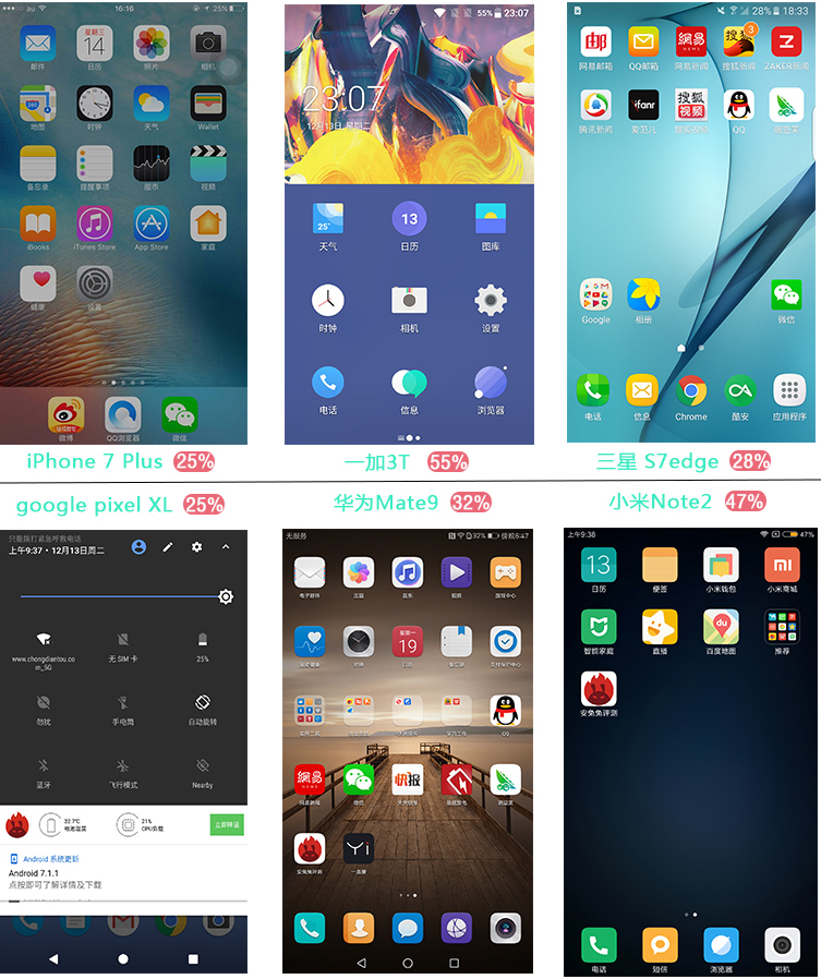 iPhone 7Plus电量为25%,一加3T电量为55%,三星S7edge电量为28%,谷歌Pixel XL电量为25%,华为Mate9电量为32%,小米Note2电量为47%。