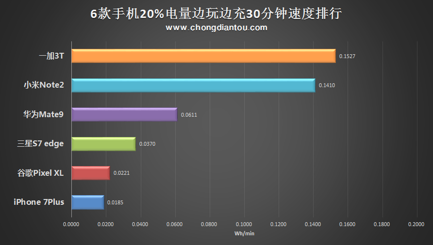 值得注意的是排在第1位的一加3T和排在第2位的华为Mate9两者的曲线在36分钟交汇,此前一加3T充电百分比要略落后于华为Mate9,在此之后反超。考虑到充电百分比除了快充技术以外,还和电池自身的电压高低、容量大小有关,因此我们使用单位时间充入电池的能量也就是Wh/min作比较。