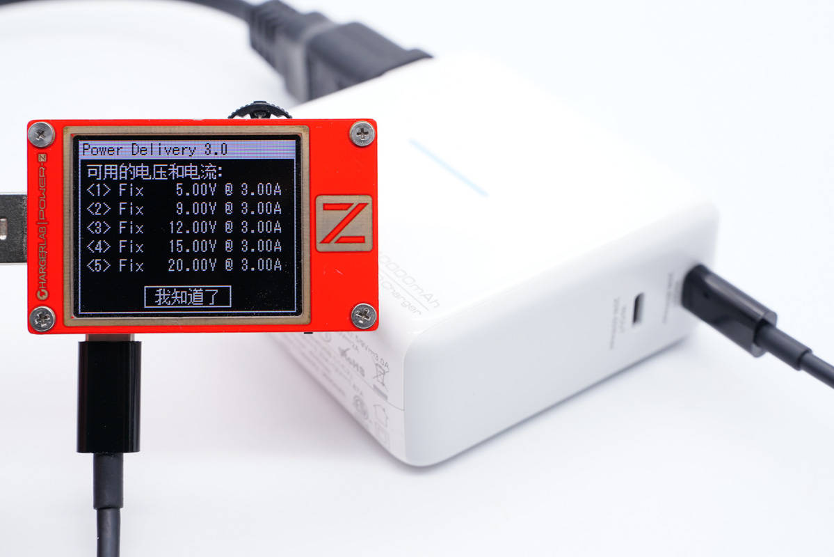 充电器模式下,使用ChargerLAB Power-Z KT002测得USB-C口支持Apple2.4A、Samsung 5V2A和DCP协议,以及QC2.0/3.0、PD3.0、PPS快充协议,最大功率能达到60W。