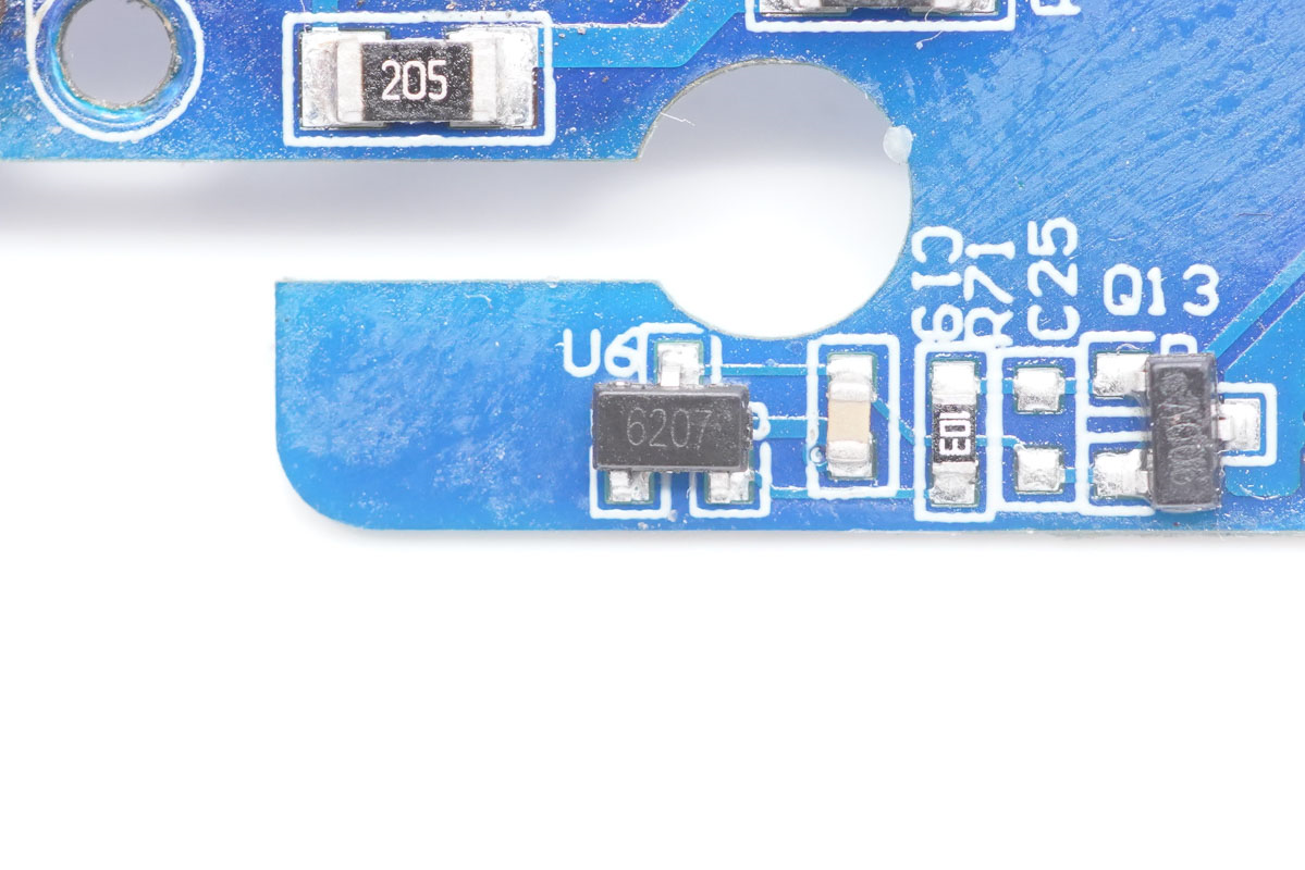 主板背面,左侧是两颗主控芯片以及两组8颗MOS管组成的升降压电路。