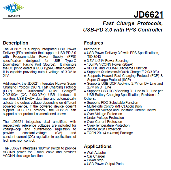 天德钰JD6621快充芯片可以兼容市面上多种快充协议,通过简洁扼要的硬件设定,配合软件可高度配合各大不同充电器规格的需求,已成为天德钰最佳的快充协议芯片代表作之一。