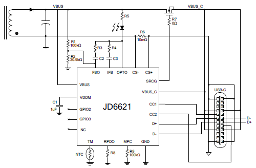 JD6621 MCU通过D+/D接口处理各种专有协议,并通过CC1/CC2引脚支持USB PD Type-C。内置可编程的线缆补偿,支持欠压保护、过压保护、可编程的过流过热保护。单一芯片可以统整市面通用的通讯协议,芯片内建恒电压/恒电流控制达到系统稳定度。