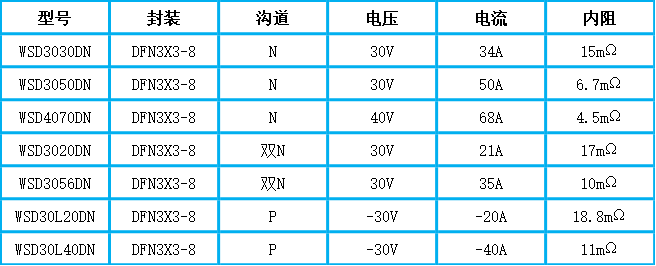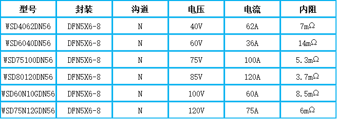 为了迎接产品新工艺以及更加广阔的市场,微硕优化了现有的产品线,推出了了一系列30V/60V/100V/120V等(SOP-8/DNF3x3/DFN5x6/TO-220等封装)低内阻、大电流、低功耗MOS管,可应用于18-120W多种功率快充方案。