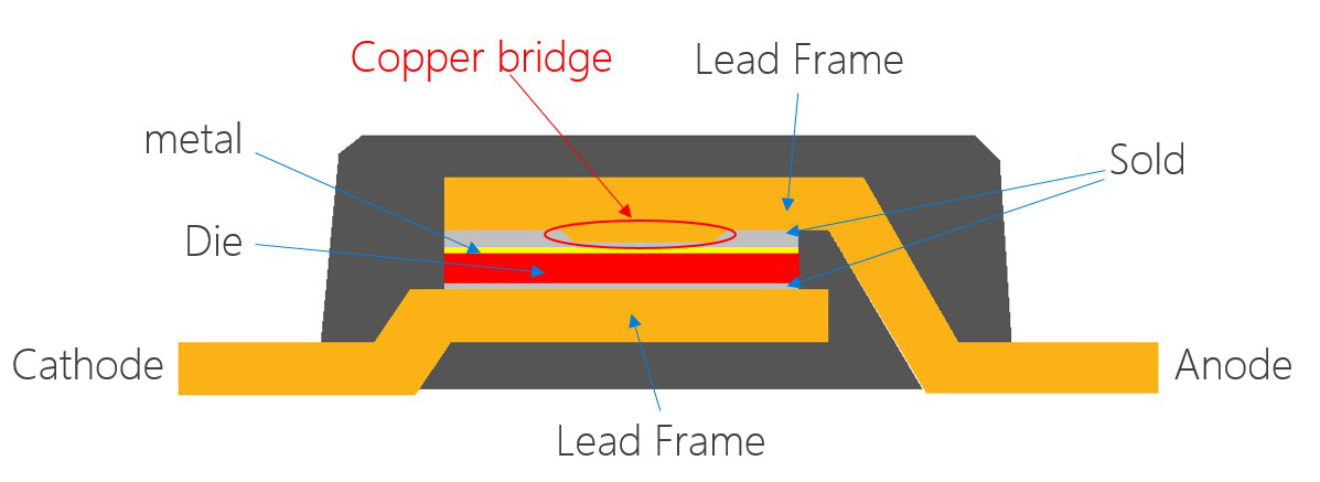 SMBF封装碳化硅肖特基二极管采用Clip Bond焊接工艺,该工艺将器件的引线框架与芯片的上下表面分别进行焊接实现连接。与传统的芯片上表面打铝绑定线的连接技术相比, Clip Bond工艺具有以下技术优势: