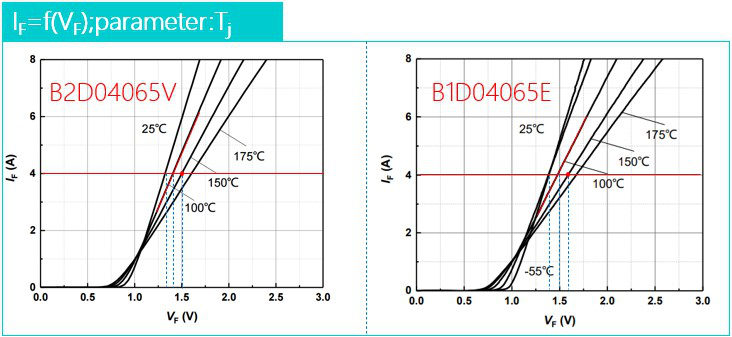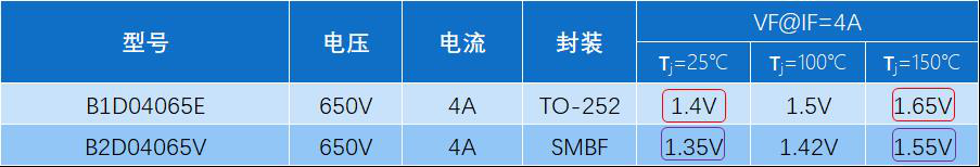 通过对比SMBF和TO-252的△VF ,△VF –SMBF<△VF –TO-252 ,B2D04065V的VF和Tj的依赖性更好,高温下的导通损耗更低。